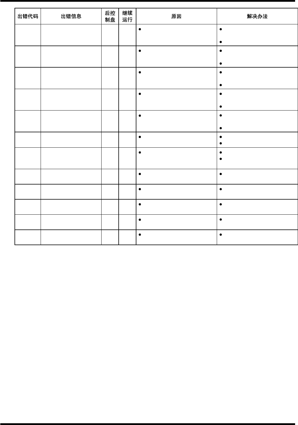 AVK3 操作手册 7.5 错误代码:与动作有关的错误( MC ) 7. 5. M C D77OCC-91- 100-A0 MC0001 空气压力低 ON OK 没有空气供应。 气压小于 0.4Mpa ( M )。 气压传感器损坏或调整不当。 ( M ) 检查空气压力。 MC0003 所有轴的伺服 电机关断 ON OK 伺服电机锁定开关置于 OFF 。 安全保护停机。 将伺服电机锁定开关置于 ON 。 解决安全保护停机的原因后,按 “ …