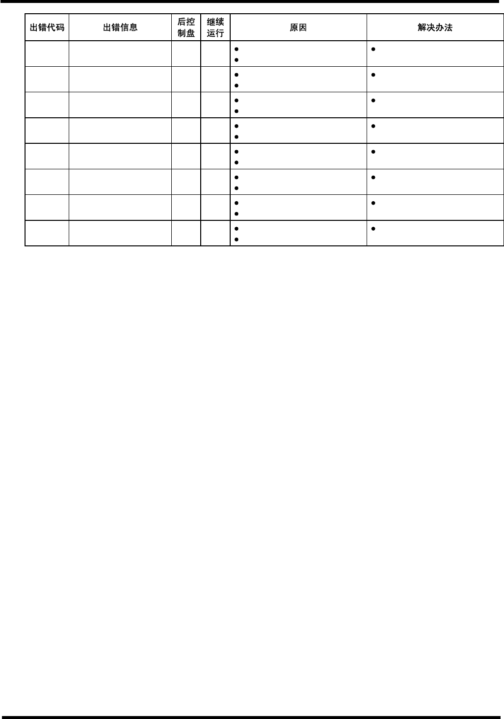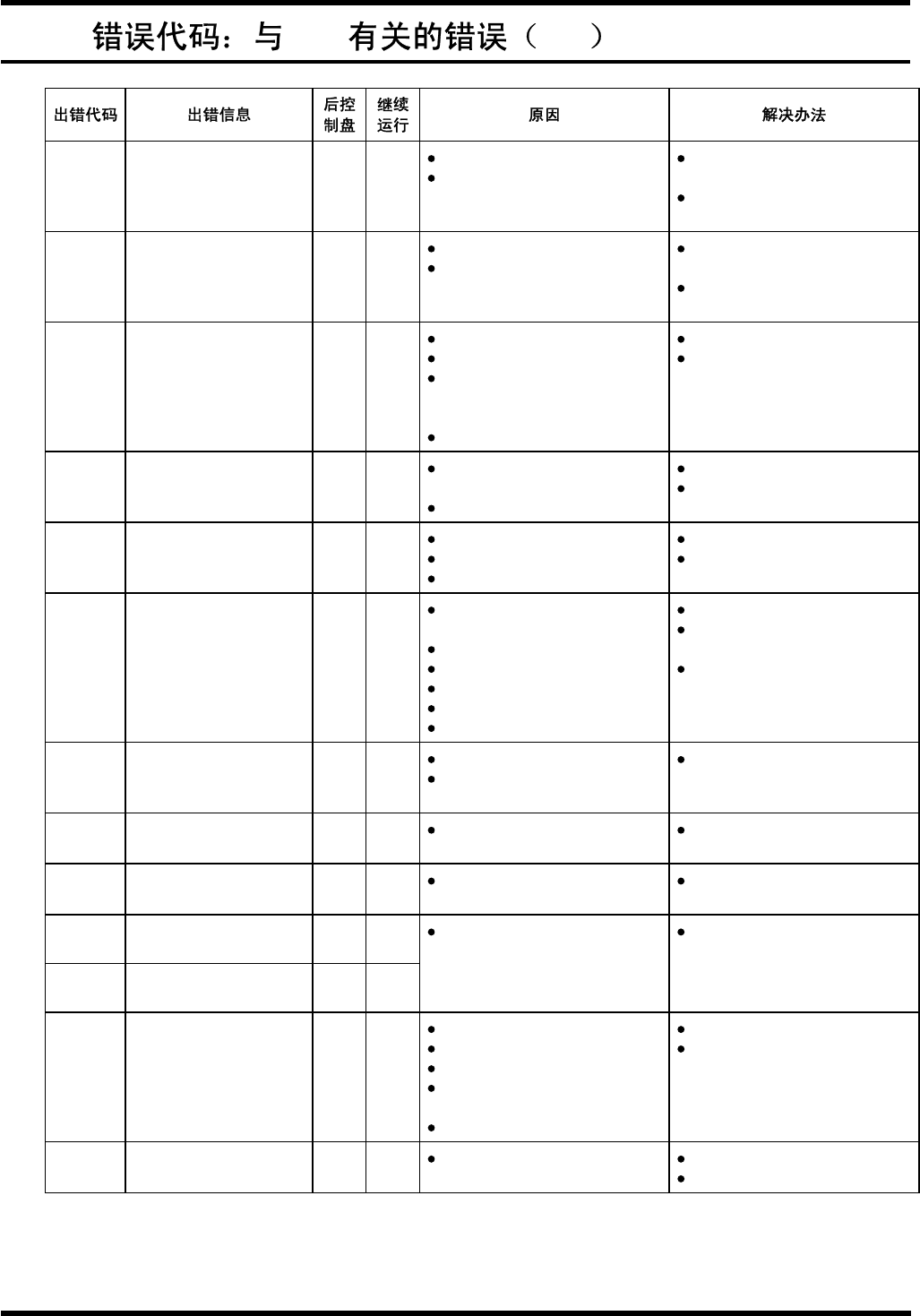 AVK3 操作手册 7.5 错误代码:与动作有关的错误( MC ) MC9054 T 轴脱开错误 ON NG T 轴光纤接头断开。 T 轴电机电源被关断。 检查 T 轴光纤接头和电源与 T 轴 电机的连接。 MC9055 U 轴脱开错误 ON NG U 轴 光纤接头断开。 U 轴 电机电源被关断。 检查 U 轴光纤接头和电源与 U 轴 电机的连接。 MC9056 H 轴脱开错误 ON NG H 轴 光纤接头断开。 H 轴 电机电源被关断…