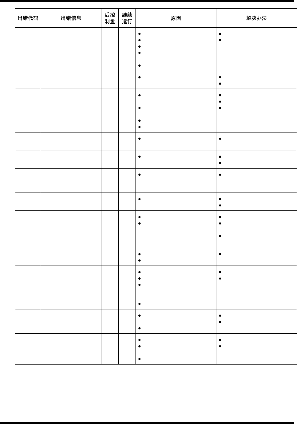 AVK3 操作手册 7.6 错误代码:与 NC 有关的错误( NC ) NC0922 θ A 轴的命令被取消 ON NG θ A 轴启动的命令被取消 。 需要 检查电机驱动器和控制器。 请联系本公司服务中心。 NC0923 θ A 轴伺服脱开错误 ON NG θ A 轴伺服锁定脱开后, 执行启动 命令。 在确定伺服电机脱离开关处于 OFF 的位置之后,关断电源,然 后再打开。 NC0924 ( M ) θ A 轴有多个请求 ON NG …