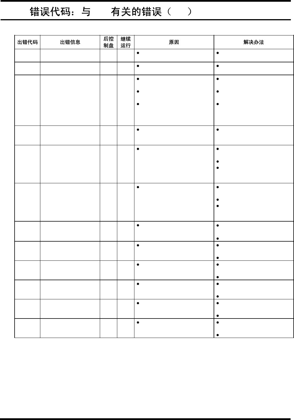 AVK3 操作手册 7.9 错误代码:与 SC 有关的错误( SC ) SC0400 定位器错位 ON NG 在在线模式或自动模式中, 印刷 线路板送达后, 定位器不能进入 定位孔,定位器传感器不亮。 检查印刷电路板送入 XY 工作台 的情况,卸下印刷电路板。 检查当定位销升起的时候, 输送 臂的销子是否正常地插在输送 基准孔中。 SC0413 定位器杆前行时间超过 ON NG 定位器在气缸接通后 5 秒钟尚 未到达前进极限位置。 检查…
