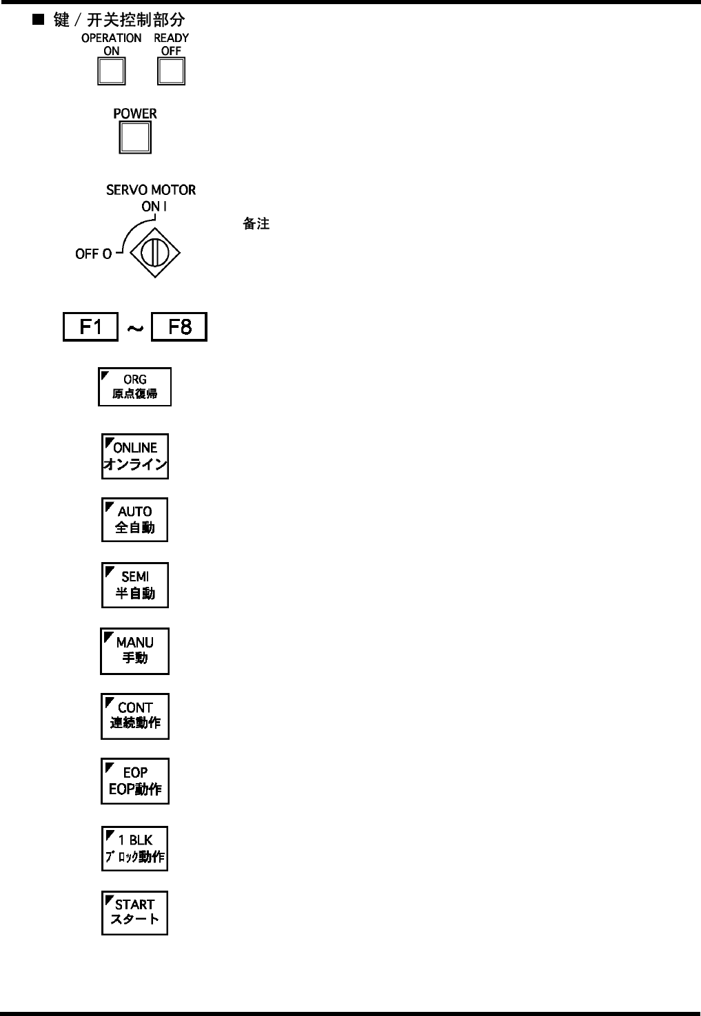 AVK3 操作手册 3.3 主操纵盘 在出错时用。 当出现一个出错信息时: 排除出错原因后,按此键清除出错信息使机器能够运行。 当未出现出错信息时: 返 回 程序 第 一 步 运 行 。 ( 机器 停 止 后 总 是 要 按 此“ RESET( 复 位 )” 键 。 按 “ RESET( 复位 ) ” 键会使机器在执行一个程序块之 后停止在 M.ORIGIN 处 ) 当在自动运行时发生插入错误 ( 包括矫正插入错误 ) 已经停机时此键…