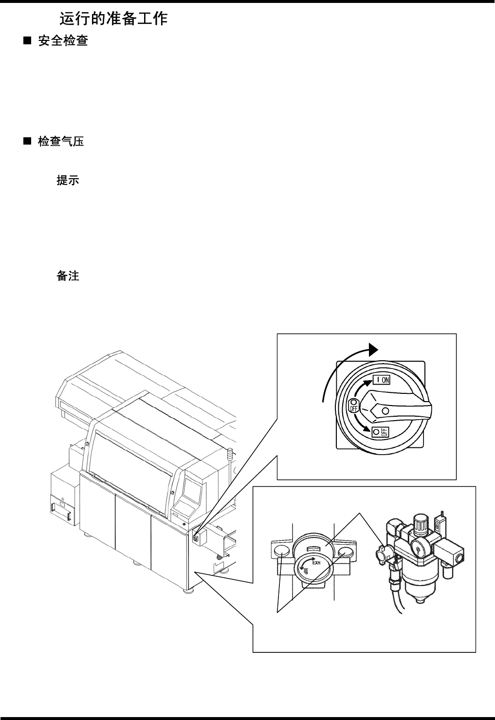 将主气源开关转到 SUP(供应)位置。气压表读数应为 0.5MPa,如果读数不对,应提起调节