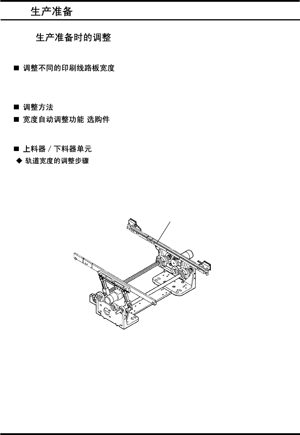 AVK3 操作手册 5.1 生产准备 5. 1. D77OCC-31- 010-A0 5.1. 1 在进行生产准备之前,需要根据印刷电路板的尺寸作出以下调整。 上料器、下料器单元: 轨道宽度 X-Y 工作台,定位器单元: 导轨宽度,基准销位置 ( ) X-Y 工作台、上料器和下料器的宽度都可自动进行调整。 1. 1. 转动旋钮、松开轨道。 2. 以手动方式, 将活动轨道调整到印刷线路板的宽度, 固定旋钮、锁定轨道。 ( 将轨道宽度调 …