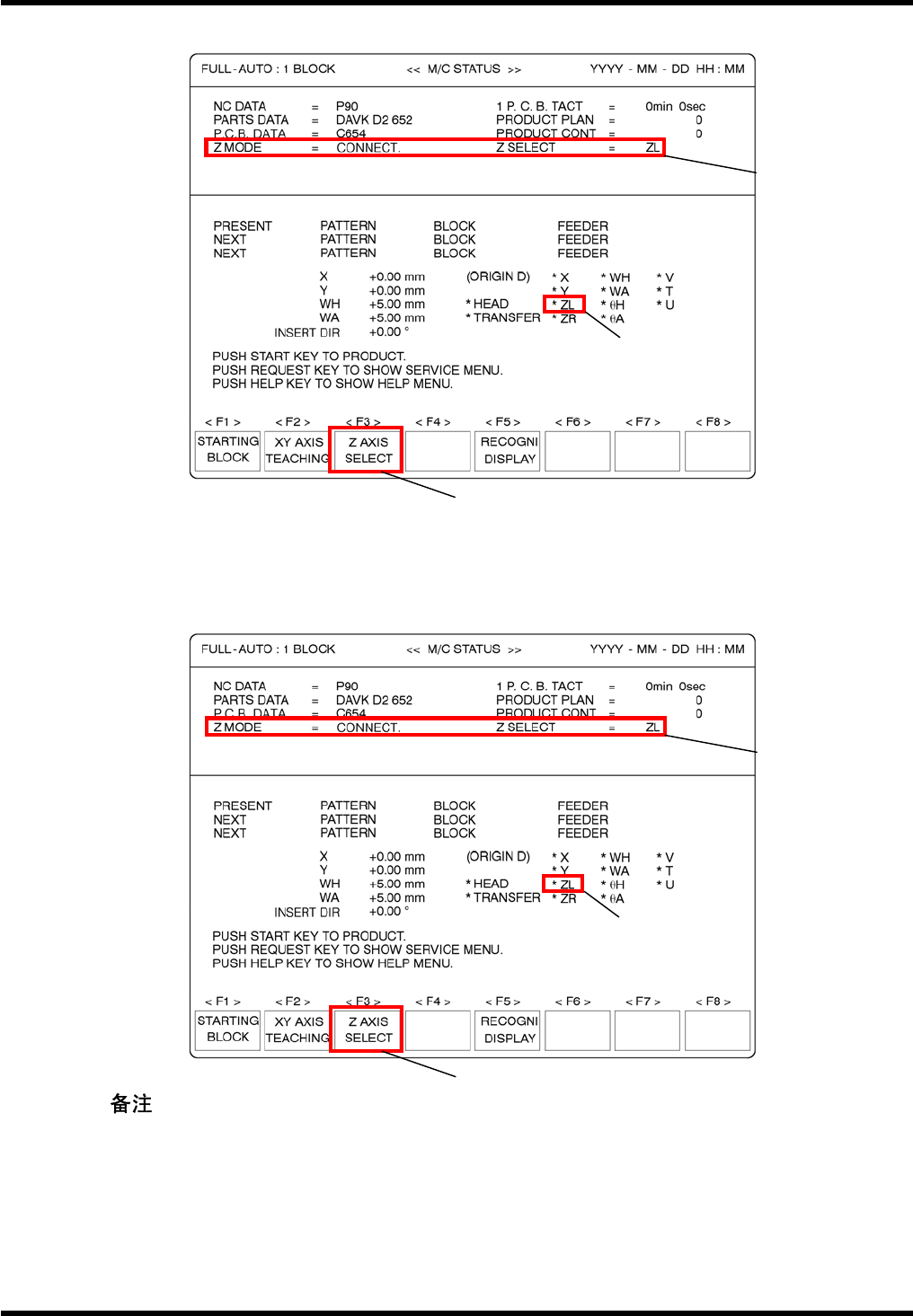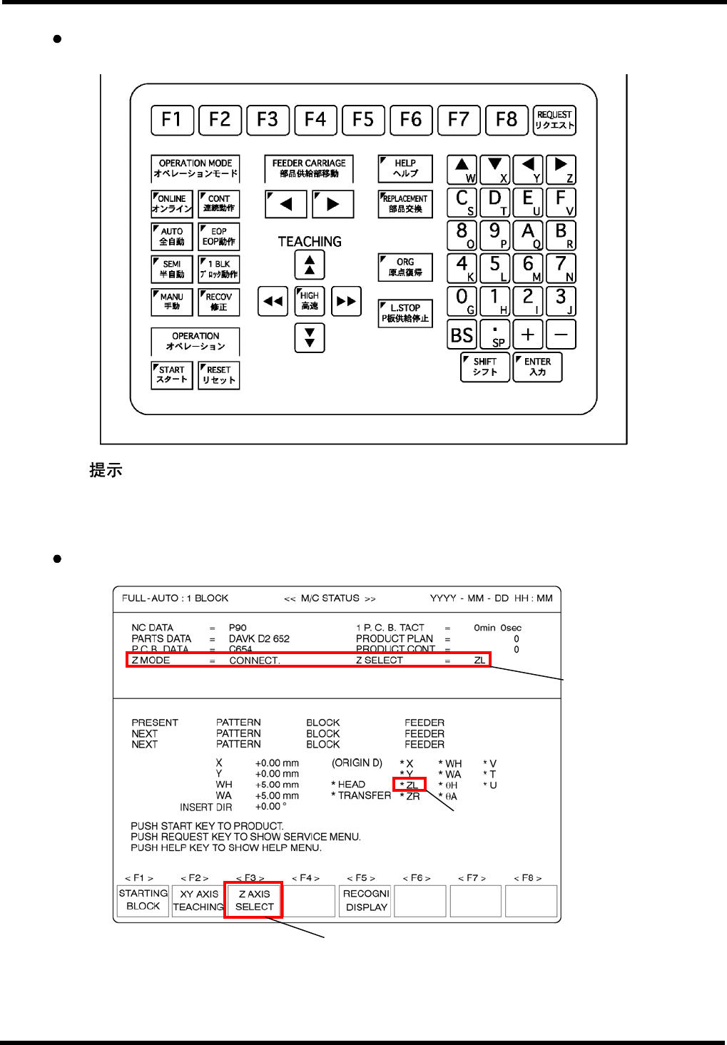 AVK3 操作手册 5.2 生产 2. 执行程序中的跳过。 按“ RESET ”,“ SEMl ”,“ 1 BLOC K ”和“ START ”键。 = = 这里执行的程序跳过是为了在自动运行开始时防止印刷线路板移动。 3. 择自动运行模式。 按“ AUTO ”将插件机设定为自动运行模式。 ( 120 站设备) ( 120 站设备) ( 120 站设备) D77OCC-31-040-A0 5.2-2