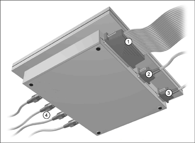 Messmittel und Werkzeuge SIPLACE Axis Tester (SAT) [03002801-01] 110 SIPLACE D-Serie Serviceanleitung (internal version) 5-2: Achsprüfgerät – Unterseite Legende 1. Anschluss für Flachbandkabel: – auf Seiten des Achsprüfg…