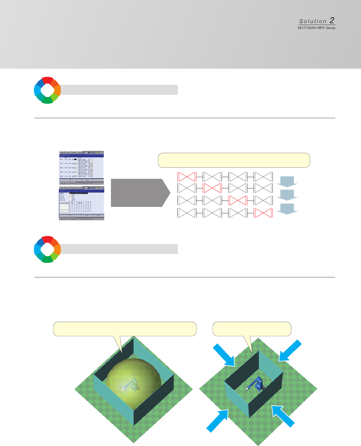 Solution 3 喷涂机用气体柜 MPXAP 自由的设置方法 · 可单体设置或安装在 DX200 侧面 · 可自由安装在控制柜外 · 可对应单枪更改为双枪的规格变更 实现小型化 · 单枪规格时, 气体柜的小型化节省了空间 丰富的标准功能 · 手动操作时 → 通过专用 JOB+ 面板功能可进行更为直观的操作 · 自动运行时 → 通过宏命令可实现和现有产品相同的操作 → 可生成使用了喷涂机控制功能的程序 更改尺寸 现有机型 对应气体柜 …