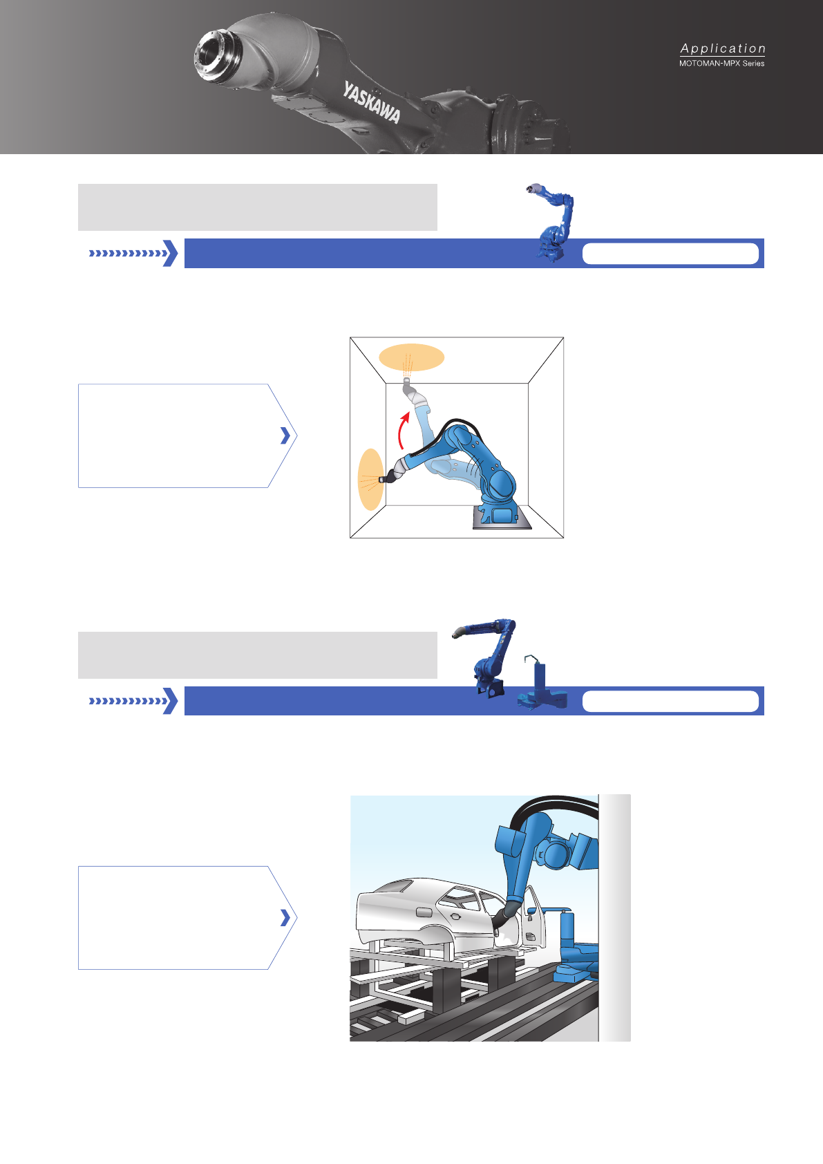 通过重新评估轴构成, 不仅可以对接近机器人的工件进行喷涂, 也可以逆肘姿势进行喷涂。 1 台机器人可喷涂范围更加扩展。 MPO10 打开车门 MPX3500 进行喷涂, 由 2 台机器人协作实现顺滑的内板喷涂。 机器人可左右对称设置, 可简便地进行动作程序复制。 对各种形状、条件的工件的喷涂 汽车生产线上的喷涂 以自由的姿势实现高效的喷涂动作! 顺畅地进行汽车内板喷涂! 对应 MPX1950, MPX2600* 对应 MPX3500 +…