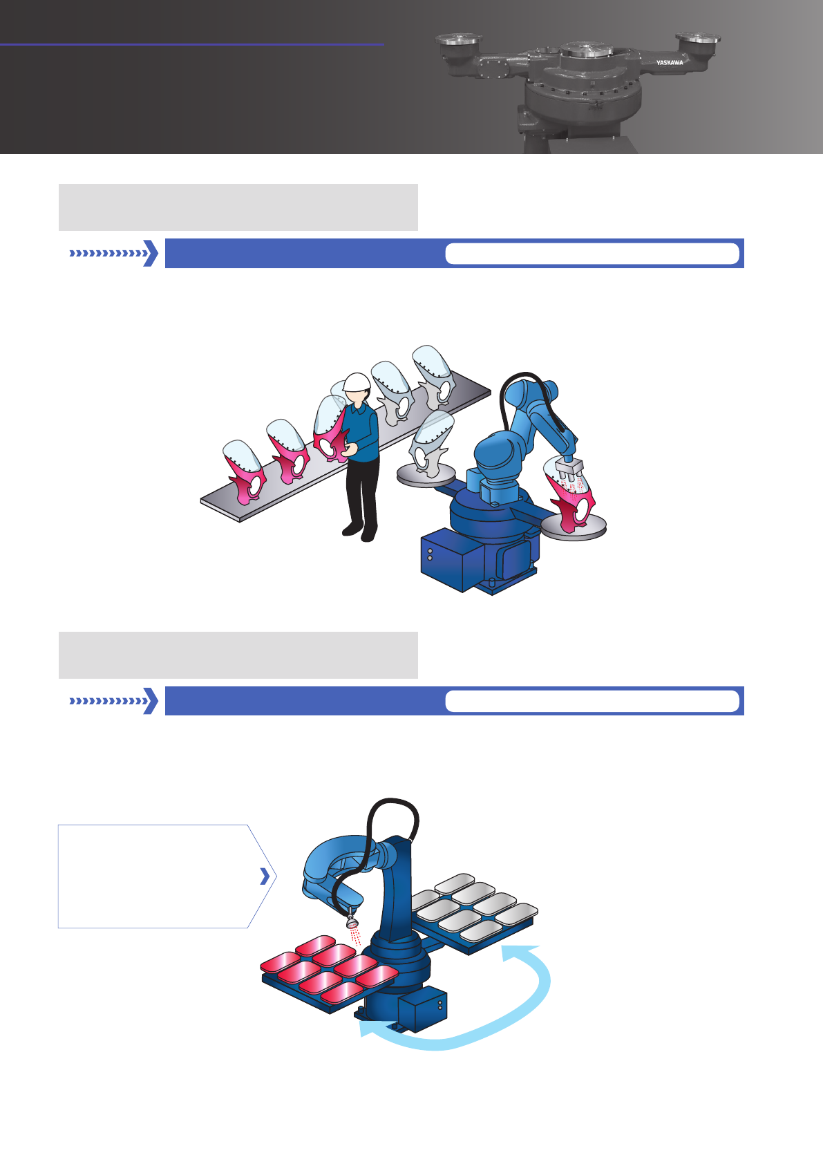 机器人进行喷涂动作时,通过人工替换工件节省了时间,可实现更高效的生产。由于动作领域更紧凑,人工的替换作业更为容易,以确保更高品质。