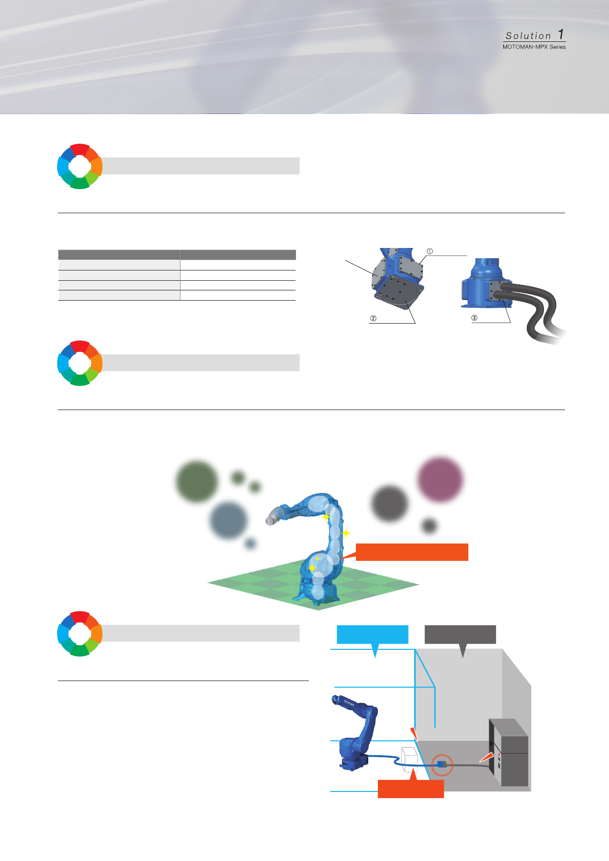 由于溶剂系喷涂造成的 可燃性气体环境 封入洁净气体 可燃性 气体 可燃性 气体 可燃性 气体 可燃性 气体 机型 MOTOMAN- 伸出口 MPX1 150 右面、 下面、 左面 MPX1950 背面、 下面 MPX2600 右面、 背面、 左面 MPX3500 右面、 背面、 左面 客户需求 客户需求 客户需求 使设备更紧凑! 降低运行成本! 减少设备安装和维护时间! 可选择供电电缆的伸出口 消耗气体少的内压防爆构造 在非防爆环境中可…
