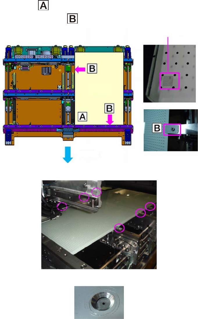 第 2 章 操作顺序书 2- 3. 校准 51 拆下治具芯片台。 6 取下 2 个 M4 × 12 , 拆下 治具芯片台。 在第 2 轨道 ~ 第 4 轨道上各安装 1 个治具芯片台。 7 请把 长 的一 方向外侧,顶紧固定。 安装时,请夹入 玻璃托板用的撑挡进行安装 。 玻璃托板用的撑 挡