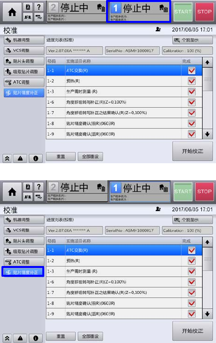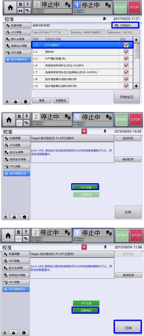 第 2 章 操作顺序书 2- 3. 校准 151 3. 准备吸嘴 3- 1. 选择 AT C 交换 (R) 选择『 AT C 交换 ( R) 』,然后选择『 个别 显示』。 3- 2. 执行 AT C 交换 (R) 选择『 AT C 交 换』。 用自动传送幅度 被调整,供料器台架下 降,安全盖子的 锁被解除。 3- 3. 吸嘴的安放 打开安全罩,拆 下 AT C ,安放精度补正 时使用的吸嘴。 安放完成后,将 ATC 放回规定的位置, …