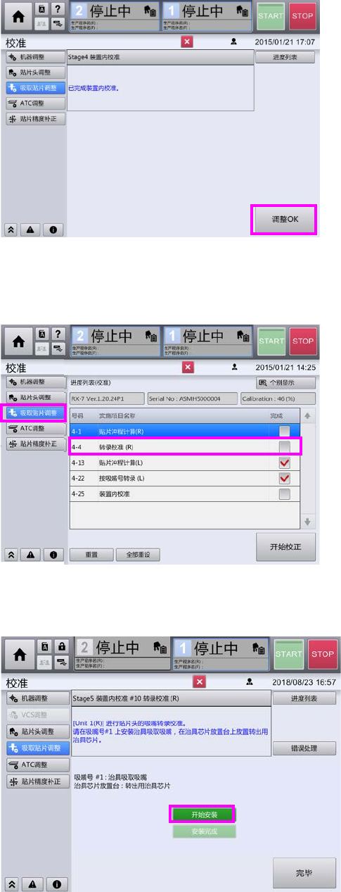 1) 选择校准菜单中的[吸取贴片调整],按[转录校准]。
