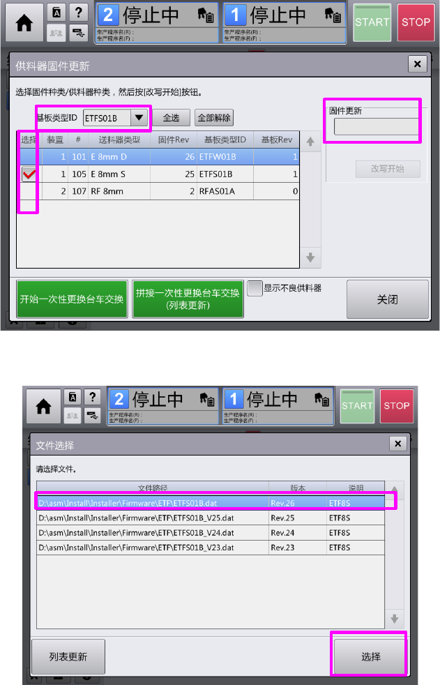 切换至供料器固件更新画面后,按下[改写开始],开始更新固件
