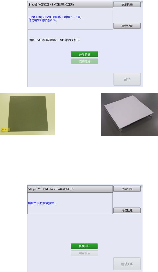 第 2 章 操作顺序书 2- 3. 校准 79 VCS 照明校准板 安装了校准板后,关闭前面护罩并触摸[安装完成]。 2 触摸“恢复”则 左右一次性更换台车上升且 门被锁定。 触摸[校准执行]。 3 校准结束后则显示结果。 4 确认差距的值为 0 〜 2 。 如果没问题,则 触摸[确定]。 移动到下一画面后,触摸[确认 OK ]。 5