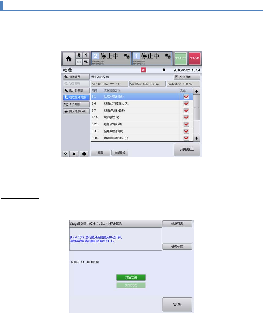 第 2 章 操作顺序书 2- 3. 校准 121 关闭前面护罩,触摸[安装完成]。 3 进行 右侧装置的一次性更换台 车上升、前面护罩的锁定。 触摸[完毕]。 4 显示确定贴装头 贴装 行程 的画面。 触摸[校准执行]。 5 进行 右左一次性更换台车上升 、前面护罩的锁定后,使用 吸嘴号 #1 的基准治具吸嘴 ,通过吸嘴 高度测量开关自 动进行高度测定。 测定 H 轴行程分别为 4mm 、 6mm 、 8mm 时的 Z 轴高度的容 许范…