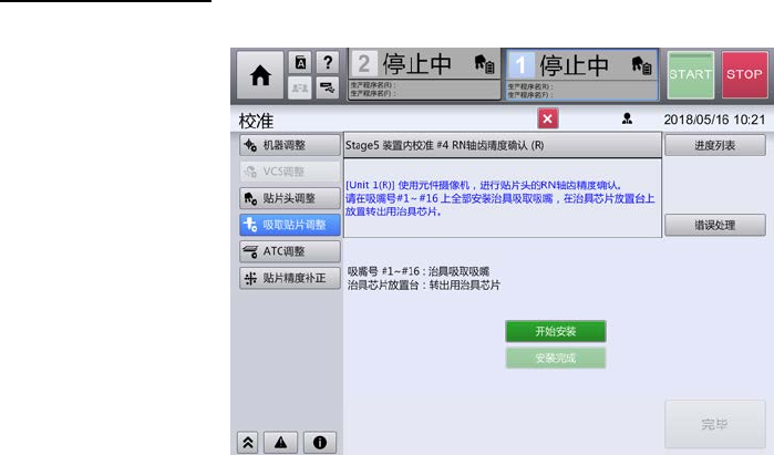 第 2 章 操作顺序书 2- 3. 校准 122 RN 轴齿轮精度 确认 触摸[开始安装]。 1 进行左右一次性 更换台车上升、前面护罩的 锁定后,贴装头向安装位置 移动, RT 轴的转塔向吸 嘴号 #1 的位置旋转。然后进 行左右一次性更换台车下降 、前面护罩解除锁定。 将治具吸嘴安装到装置的吸嘴号 #1 ~ 16 上。 2 并把玻璃芯片 (7x7) 放到治具芯片安置台上。 关闭前面护罩,触摸[安装完成]。 3 进行右侧装置的 一次性…