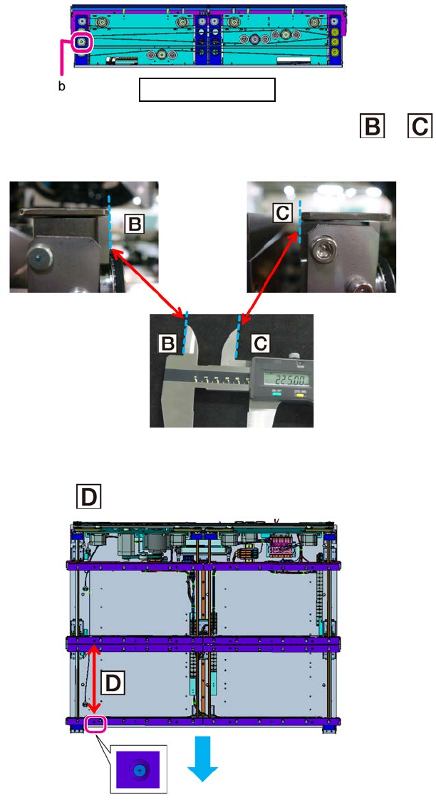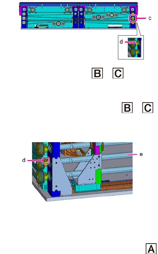 第 2 章 操作顺序书 2- 4. 维护 166 按住皮带轮 (c) ,同时松开 CP 螺栓 (d) 。 6 将数显游标卡尺放在第 1 轨道和第 3 轨道之 和 的位置。 7 参阅操作顺序 4 的图。 慢慢地旋转轴 (e) ,直至轨道分别碰到数显游标卡尺之 和 的侧面。 8 顺时针方向旋转 :传送宽度收缩 逆时针方向旋转 :传送宽度放宽 确定好轨道宽度后,取下数显游标卡尺,旋紧 CP 螺栓 (d) 。 9 紧固扭矩: 1 N·m ±0.…