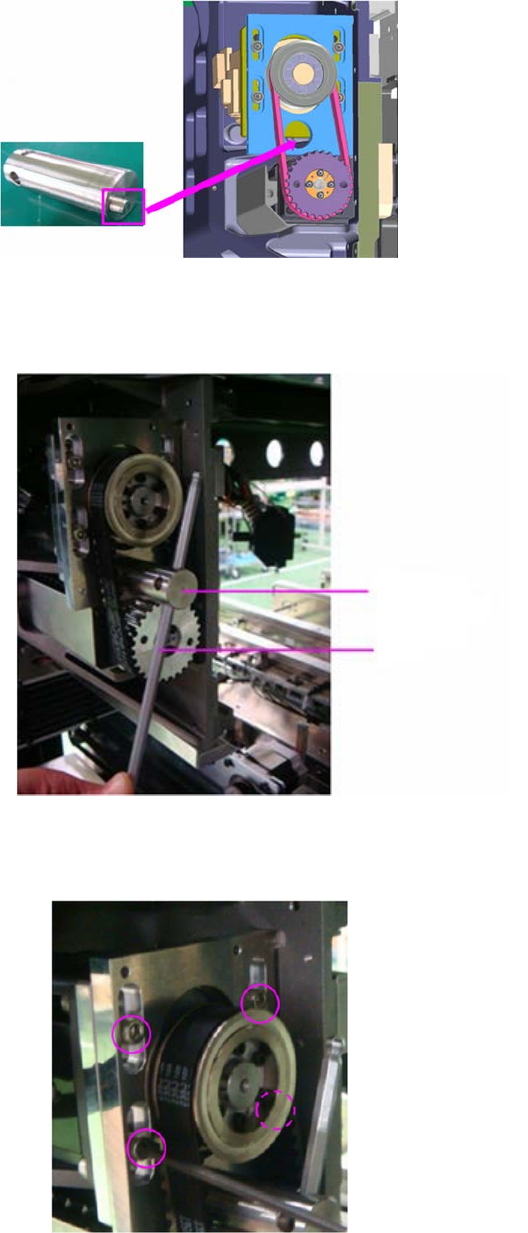 第 2 章 操作顺序书 2- 5. 配件更换 252 准备皮带轮调节治具,把前端部放入图示的槽孔部。 1 将 L 型扳手等插入皮带轮调节治具的开孔部。 2 旋转 扳手时电动机会滑动, 皮带 受到张力。 按住皮带轮调节治具,使皮带达到不松弛的程度即可,同时固定张紧板的安装螺丝( 4 3 处)。 L 型扳手 皮带轮调节治具