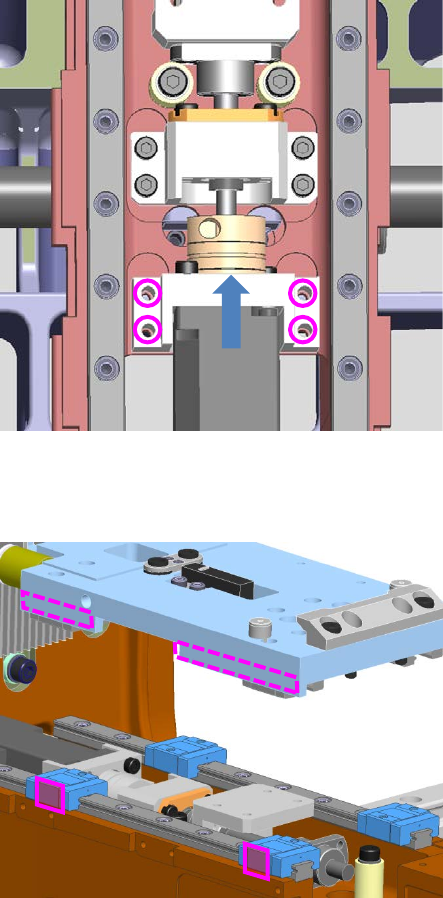 第 2 章 操作顺序书 2- 5. 配件更换 343 用 4 个螺丝( C4x10 )暂时固定底座板。 13 螺丝拧紧扭矩: 0.8N ・ m 用 8 个螺丝( C3x6 )将底座板固定到 LM 块上。 14 请向箭头方向按 住底座板,进行固定。 螺丝拧紧扭矩: 2.0±0.1N ・ m