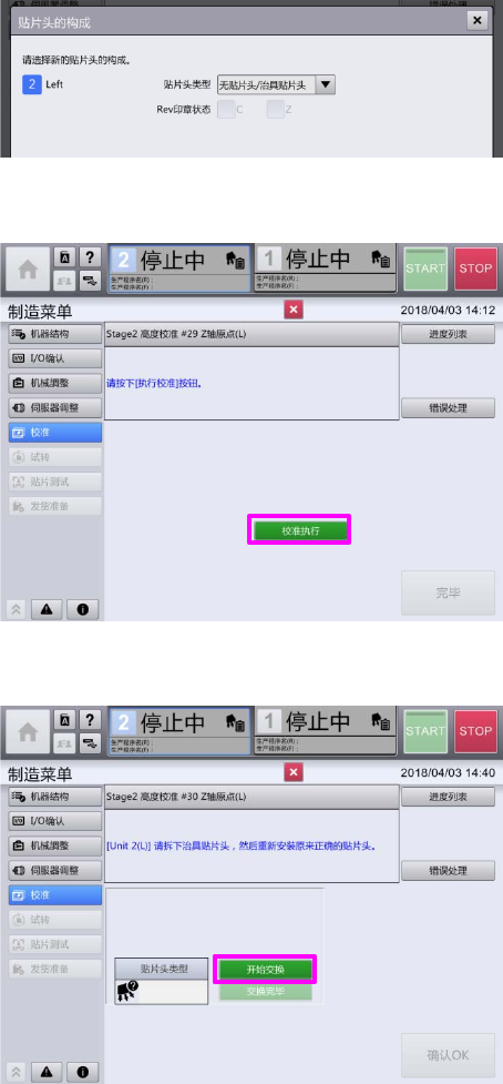 校准完成后,会变为贴片头更换的画面,请按“开始交换(更换)”。