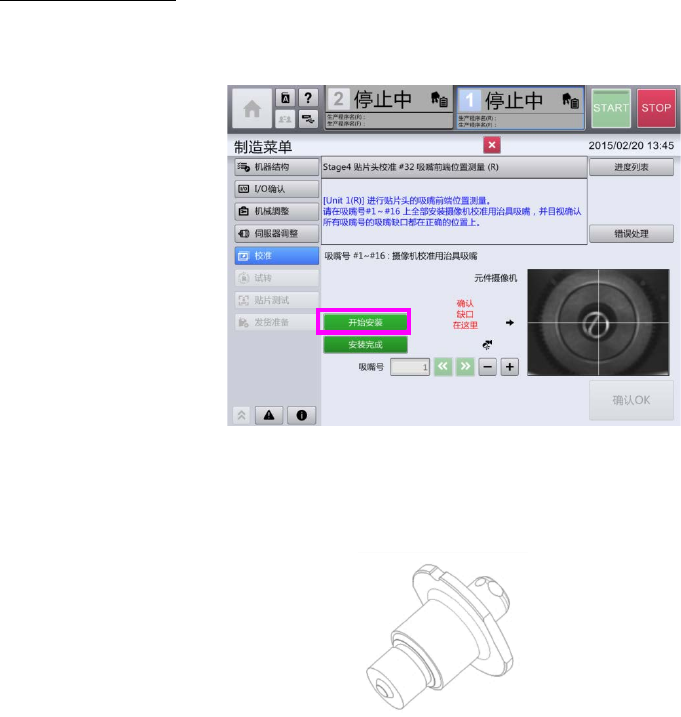 第 7 章 故障分析 7- 5. 贴片头单元原点消失时的恢复方法 吸嘴前端位置测定 1. 按[开始安装 ]。 2. 按[复归]。 3. 请打开门,将 摄像机 校正用 治具 吸嘴安装到 #1 ~ #16 轴上 。 4. 关闭门,按[安 装完成]。 5. 按[复归]。 51