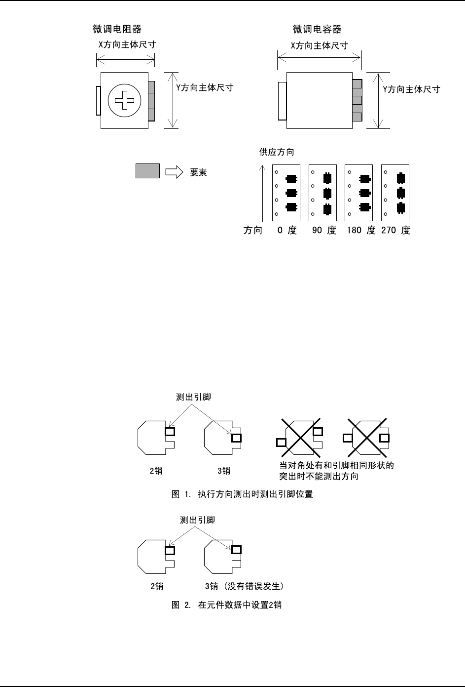 3. 元件数据 PRG-NXTS-001S0 196 NXT 系列 编程手册 在 Element Information 中 设定引脚数量 (2 或 3) ,引脚宽度,引脚长度 和宽度公差值。 使用 VT7 1 处理方式进行 元件的定位,根据结果检测一个引脚 方向来执行方向检查。但是, 被检测出的引脚不用于定位。元 件基准点是元件中心。 备注 )只有在一条边上存在两个或三个引脚的情况下才可执行方向检查。 备注 )如果在进行检测的 引脚对…