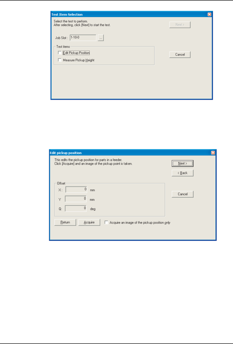 5. 在机器上编辑 Job (使用 MEdit) PRG-NXTS-001S0 258 NXT 系列 编程手册 12.通过所显示的图像 检查 X- 和 Y- 方向上 的吸取位置。如果需 要移动吸取位置 ,请单击定 位按钮 (带有四个箭头的按钮) ,然后在图像中单击要执行吸取的位置。 13.如果元件的吸取位置正确,请单击 [Next] 。如果还没有执行吸取高度 测试,请继续执 行步骤 19。 测试和编辑供料器上的元件吸取高度 14.显示 …