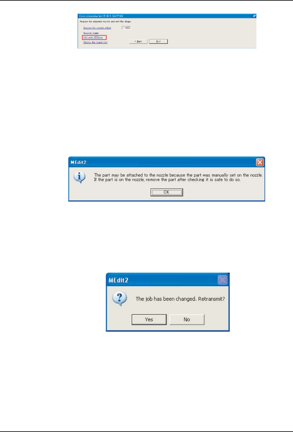 5. 在机器上编辑 Job (使用 MEdit) PRG-NXTS-001S0 270 NXT 系列 编程手册 13.选择最顶端的图像 ,然后单击 [Save]。 注意 )使用 MEdit 更新 Job 时,执行更新后不会立即获取已存在的图像。 调整影像处理高度 (使用侧光相机时) 14.按照以下步骤进行影像处理高度的调整。 a. 请 按下机器操作面板的 [MONITOR] 按钮。 b. 使用上下光标键更改影像高度修正量的设 置。指定所…