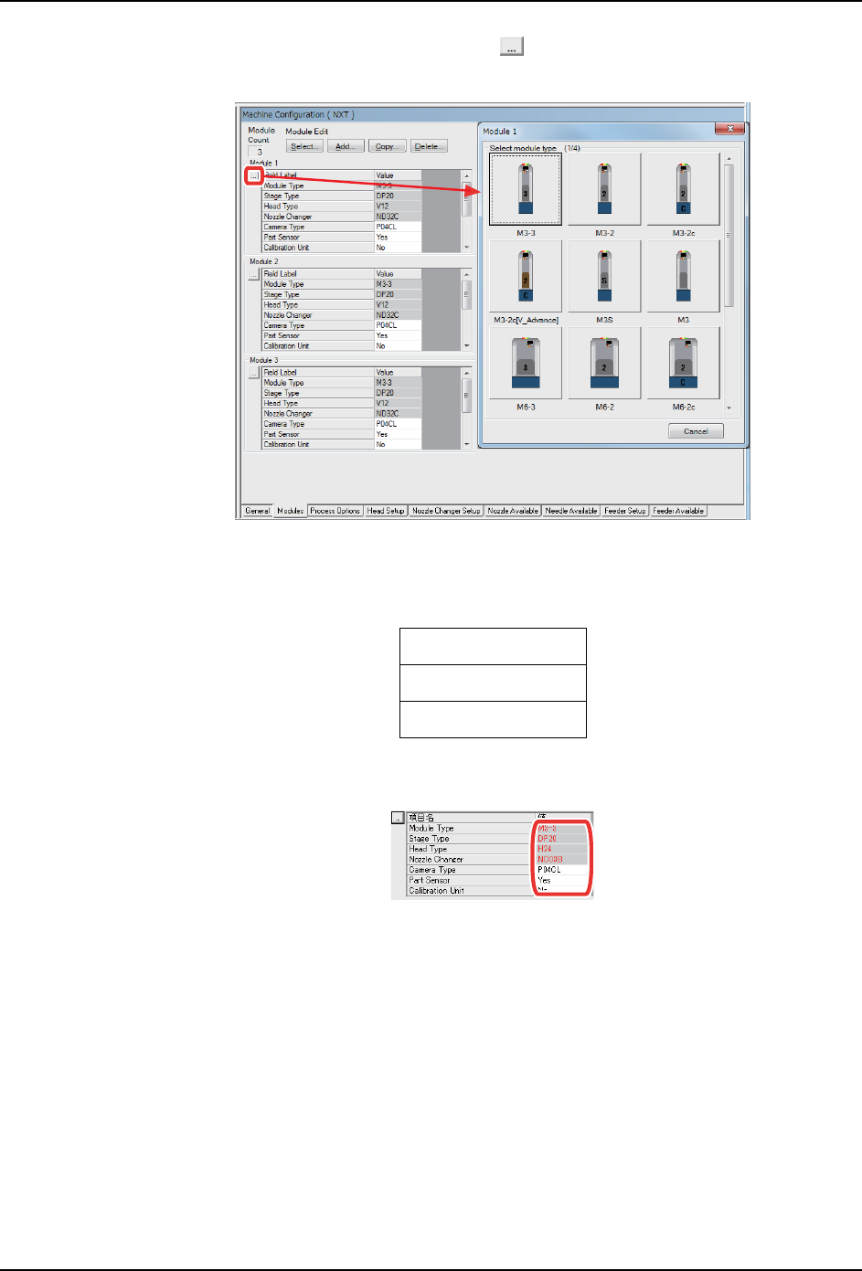 2. Job 编制器 PRG-NXTS-001S0 20 NXT 系列 编程手册 4. 设定模组配置。各模组数据中点击左侧的 [ ] 键,请从对话框选择工作模组类型、头 类型、Stage 类型、Nozzle Chang er 类型。 注意 ·以下组合时无法混载模组。 ·也可以在 Field 选择各 Unit, 但做无效设定时文本会显示红色及无法执行优化。 5. 请参考以下表格中的说明,必要时,也请 进行背景为白色的其他项目的设定 。 N…