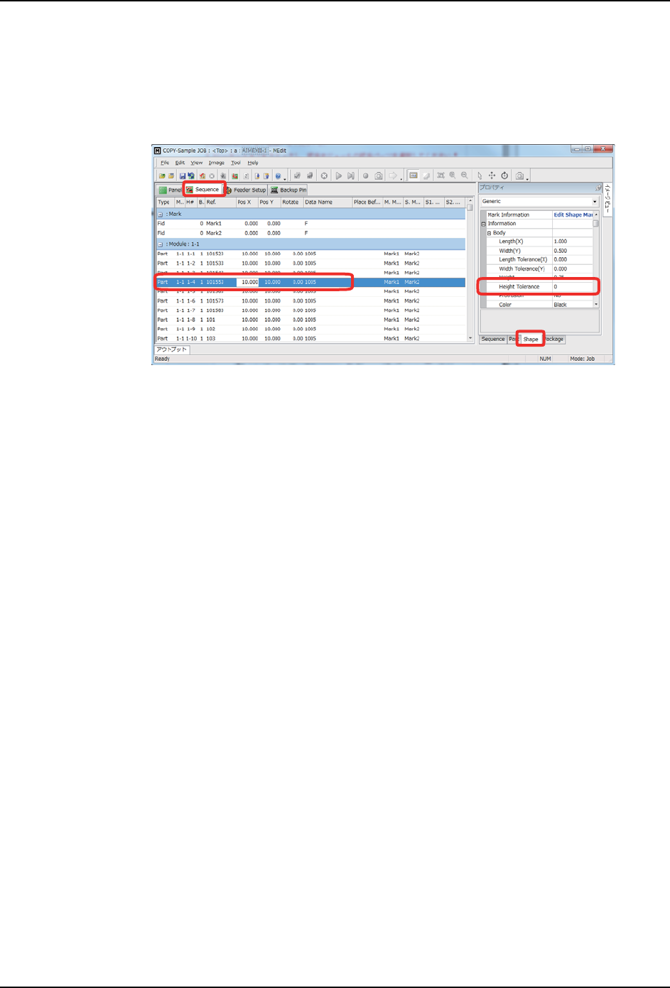 2. Job 编制器 PRG-NXTS-001S0 46 NXT 系列 编程手册 设定 MEdi t 1. 请 在 MEdit 打 开 Job。 2. 请点击 Sequence 选择对应模组的对应元件。 3. 请 点击 MEdit 右下面的 Shape 进行以下的设定。 请在 Property 的列表中选择 [G eneric] 或机器类型 - [Information] - [Body] - [Height Toler ance]: …