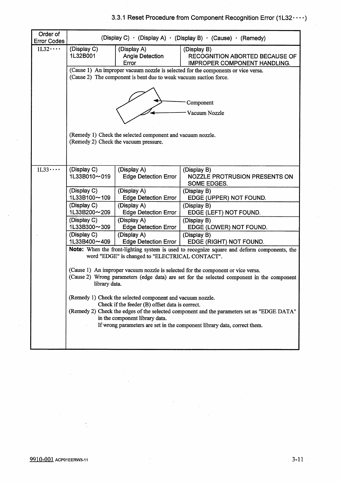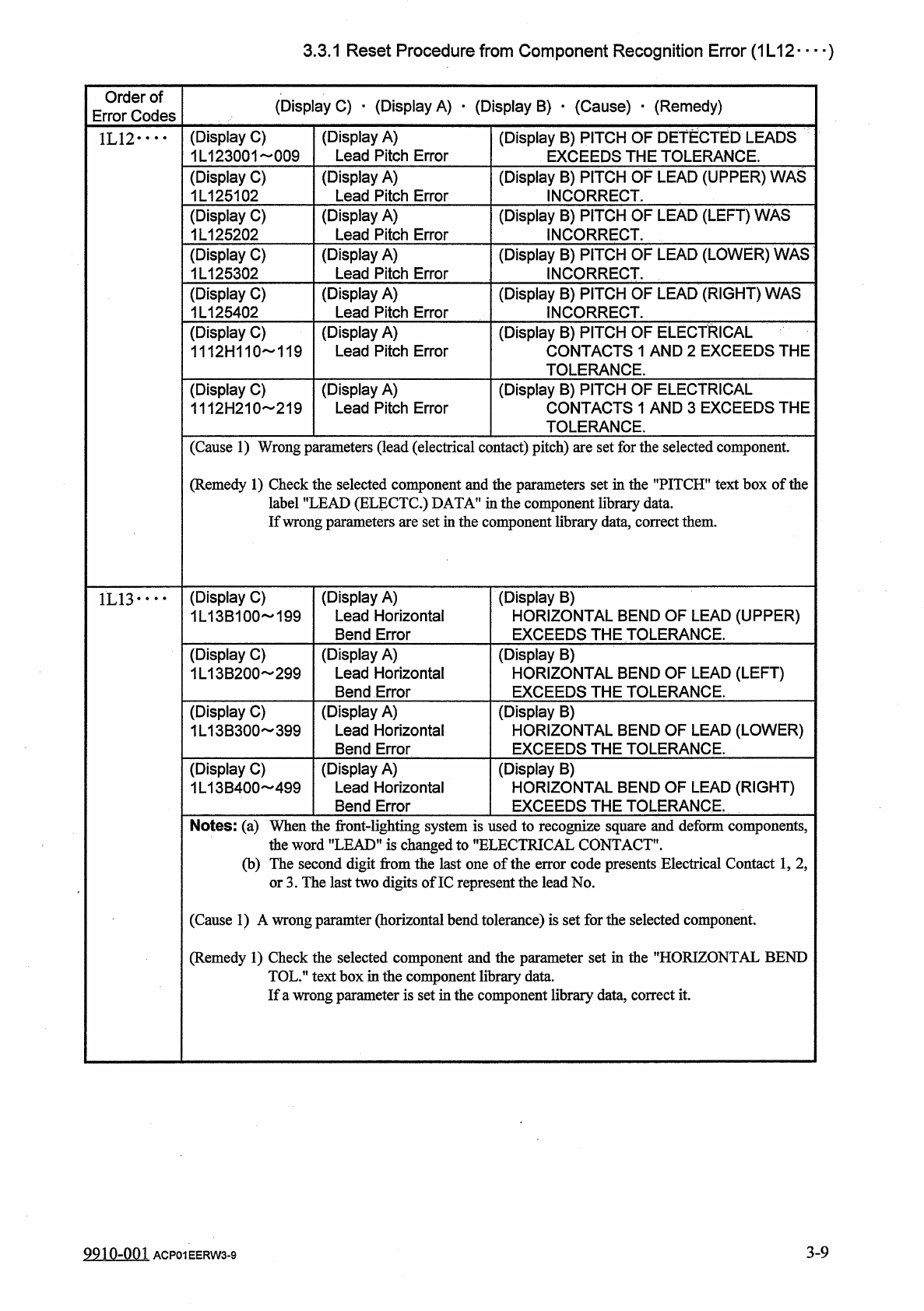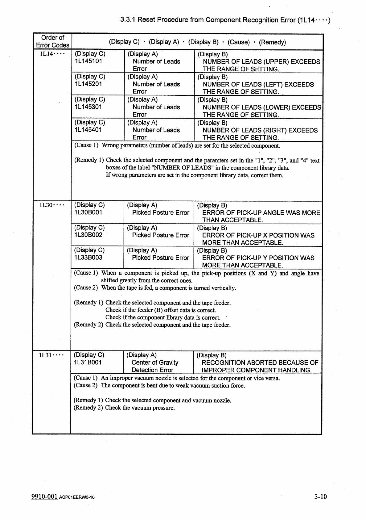 3.3 . 1 Reset Procedure from Component Recognition Error ( 1 L 14 — ) Order of Error Codes ( Display C ) • ( Display A ) - ( Display B ) _ ( Cause ) • ( Remedy ) ( Display C ) 1 L 145101 ( Display A ) Number of Leads Err…
