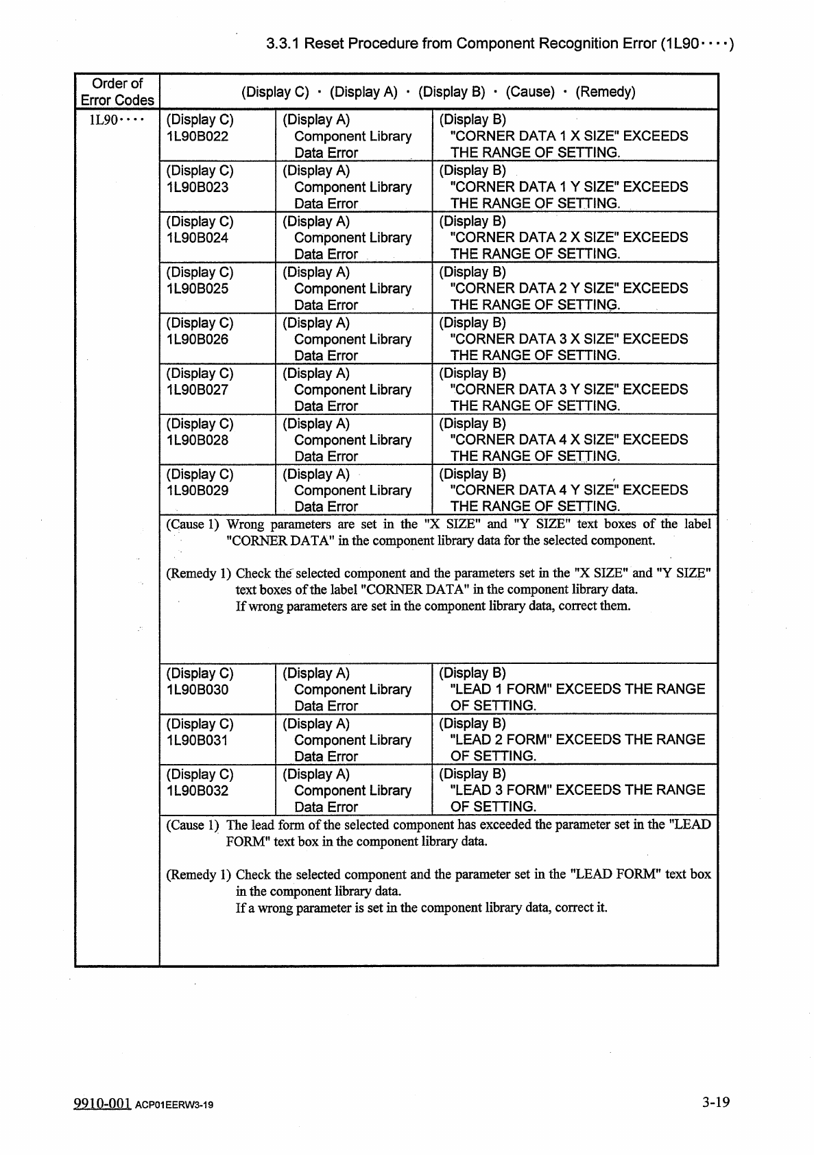 3.3 . 1 Reset Procedure from Component Recognition Error ( 1 L 90 — ) Order of Error Codes ( Display C ) • ( Display A ) • ( Display B ) • ( Cause ) • ( Remedy ) ( Display C ) 1 L 90 B 012 ( Display A ) Component Library…