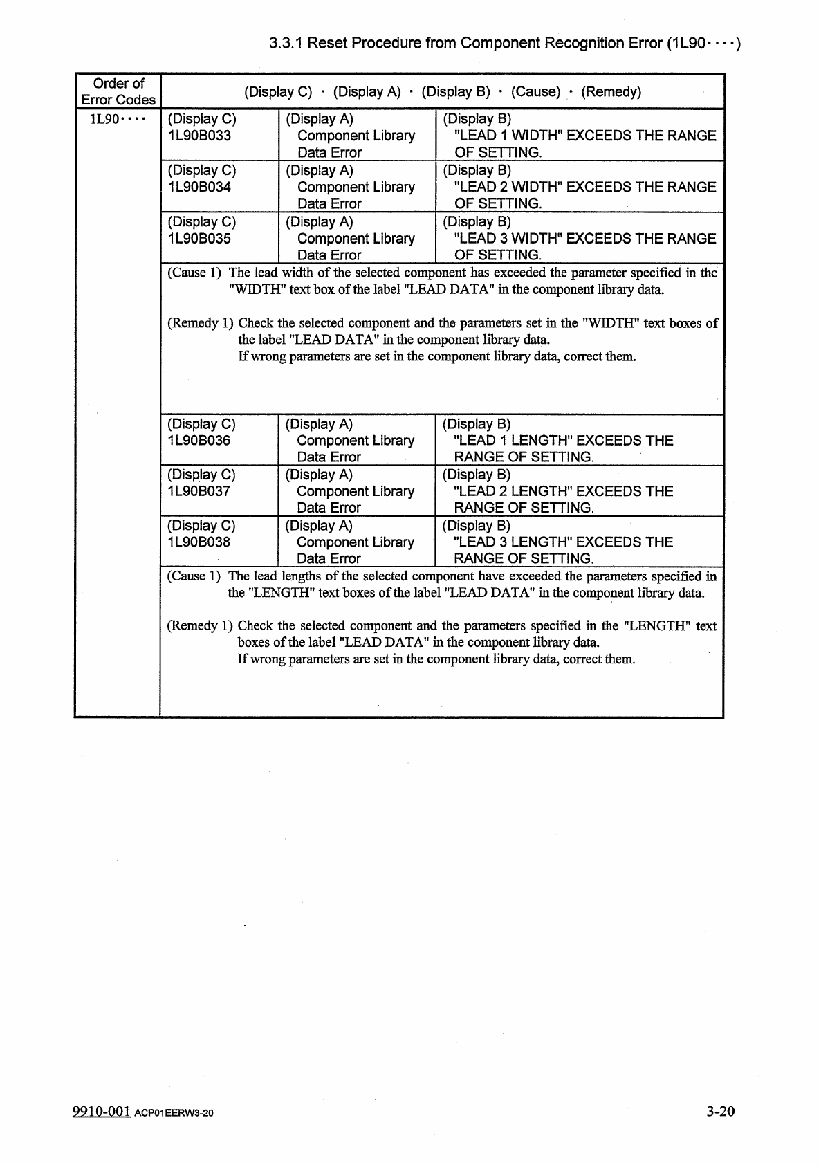 3.3 . 1 Reset Procedure from Component Recognition Error ( 1 L 90 — ) Order of Error Codes ( Display C ) ■ ( Display A ) • ( Display B ) • ( Cause ) • ( Remedy ) ( Display C ) 1 L 90 B 022 ( Display B ) " CORNER DAT…