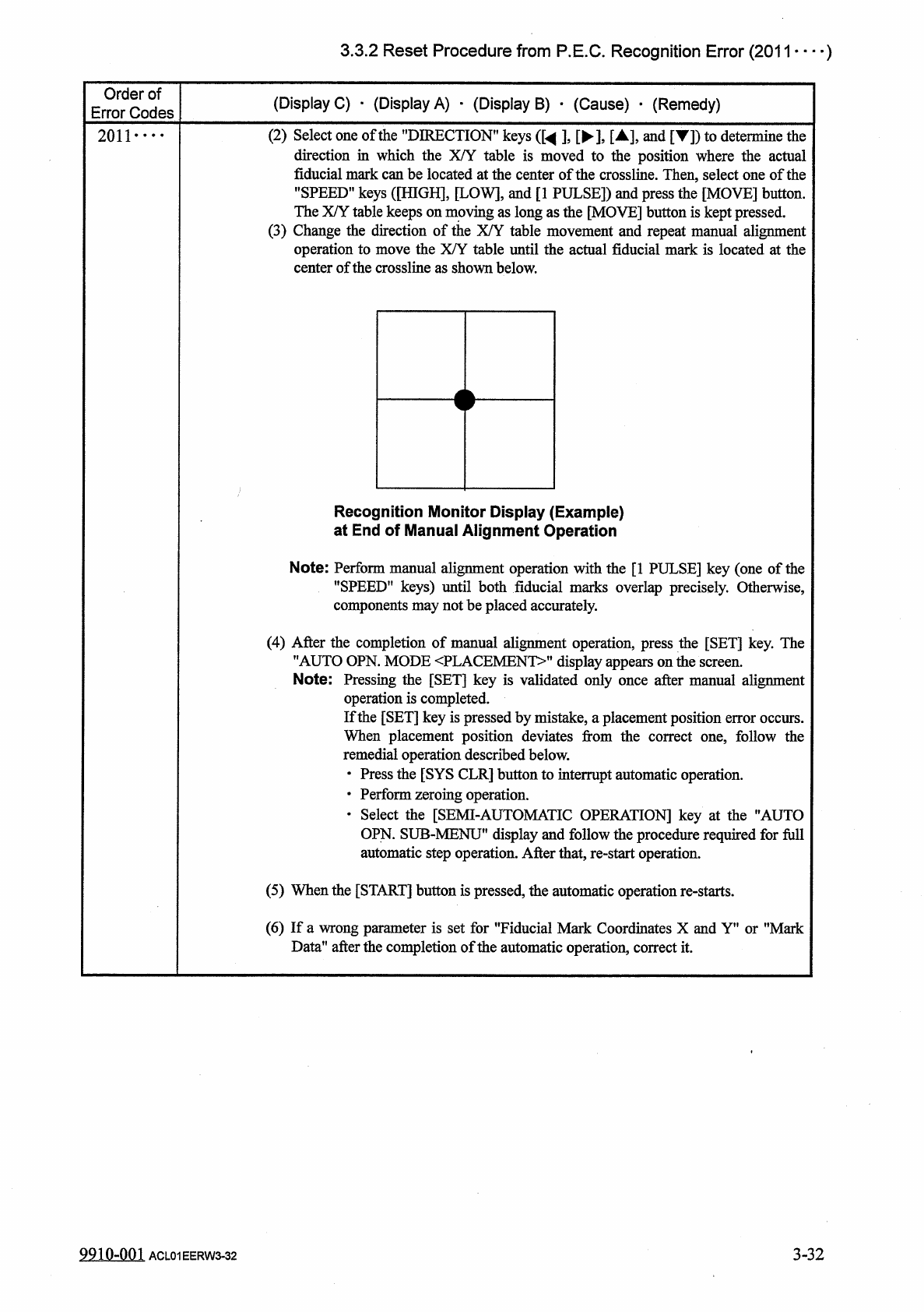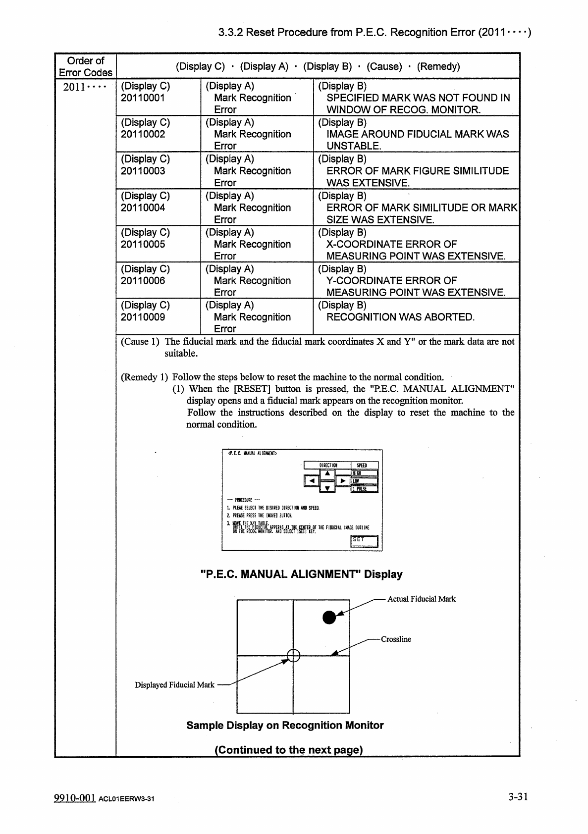 3.3 . 2 Reset Procedure from P . E . C . Recognition Error ( 2011 • • • _ ) Order of Error Codes ( Display C ) . ( Display A ) . ( Display B ) • ( Cause ) _ ( Remedy ) 2011 . . ( 2 ) Select one of the " DIRECTION &q…