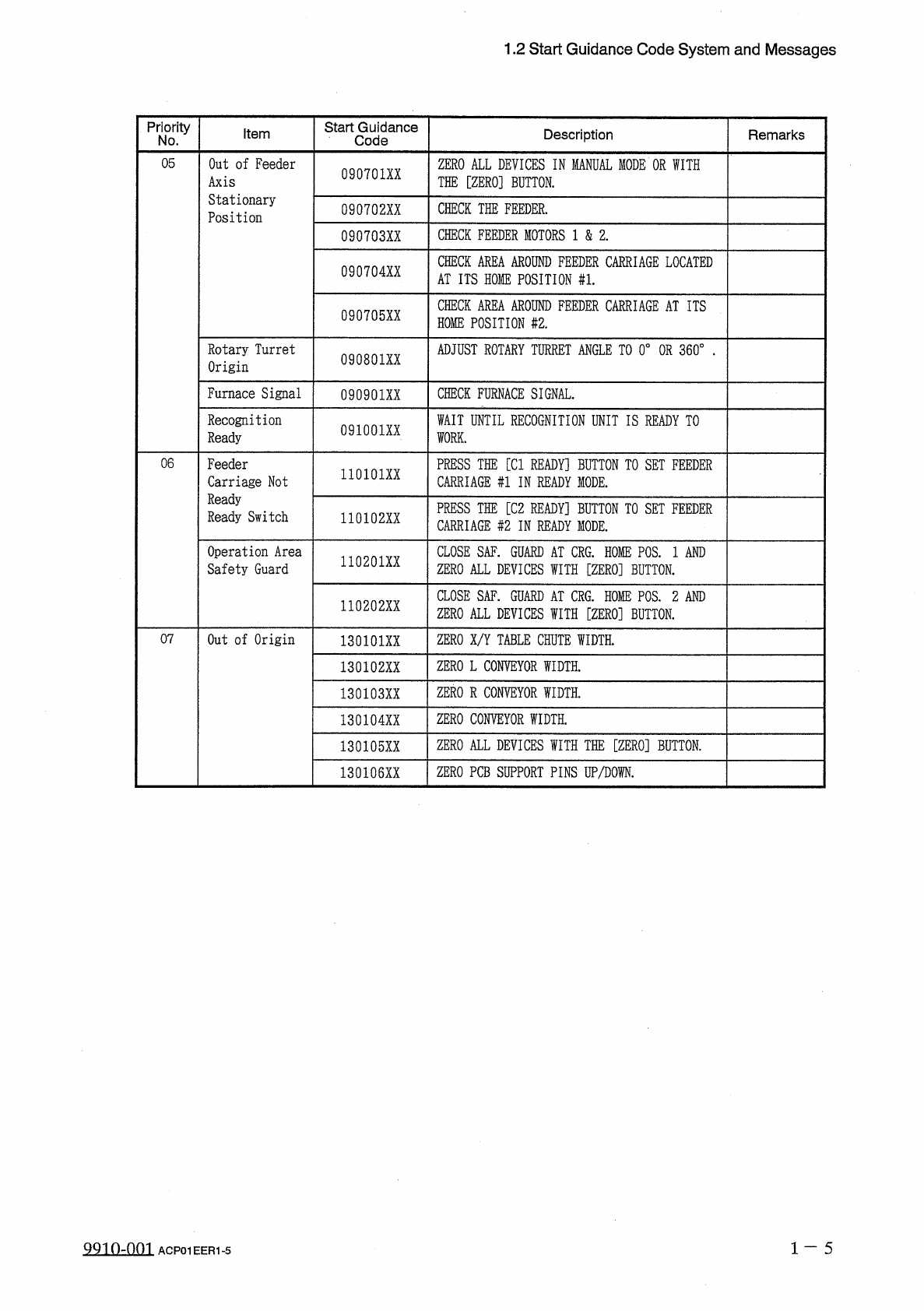 1.2 Start Guidance Code System and Messages Priority Start Guidance Code Item Description Remarks No . Out of Feeder Axis Stationary - Position 05 ZERO ALL DEVICES IN MANUAL MODE OR WITH THE [ ZERO ] BUTTON . 090701 XX C…