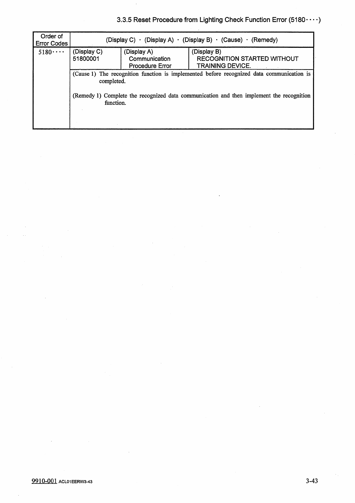 3.3 . 5 Reset Procedure from Lighting Check Function Error ( 5180 — ) Order of Error Codes ( Display C ) • ( Display A ) • ( Display B ) • ( Cause ) _ ( Remedy ) ( Display C ) 51800001 ( Display A ) Communication Procedu…