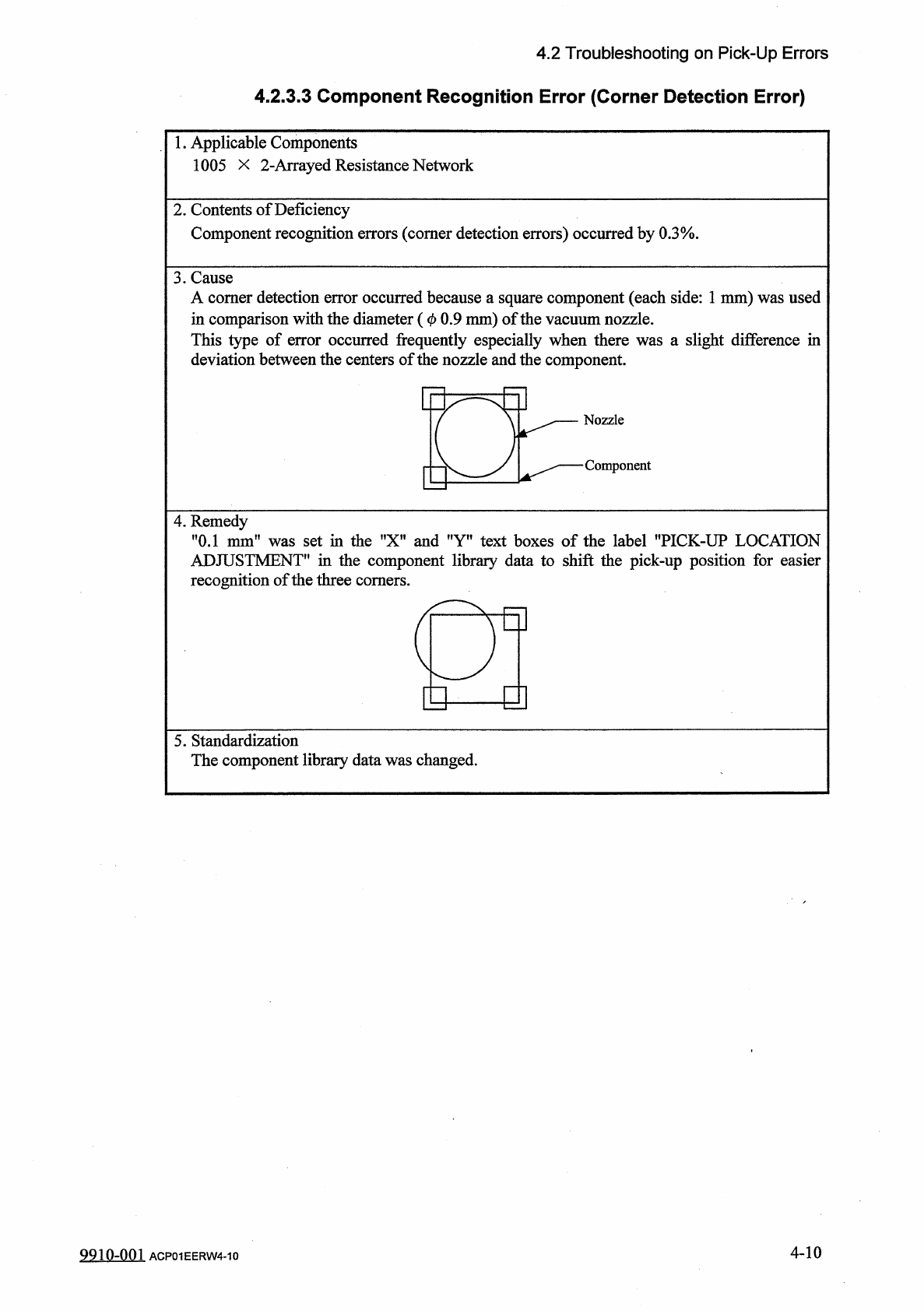 4.2 Troubleshooting on Pick - Up Errors 4.2 . 3.3 Component Recognition Error ( Corner Detection Error ) 1 • Applicable Components 1005 X 2 - Arrayed Resistance Network 2 . Contents of Deficiency Component recognition er…