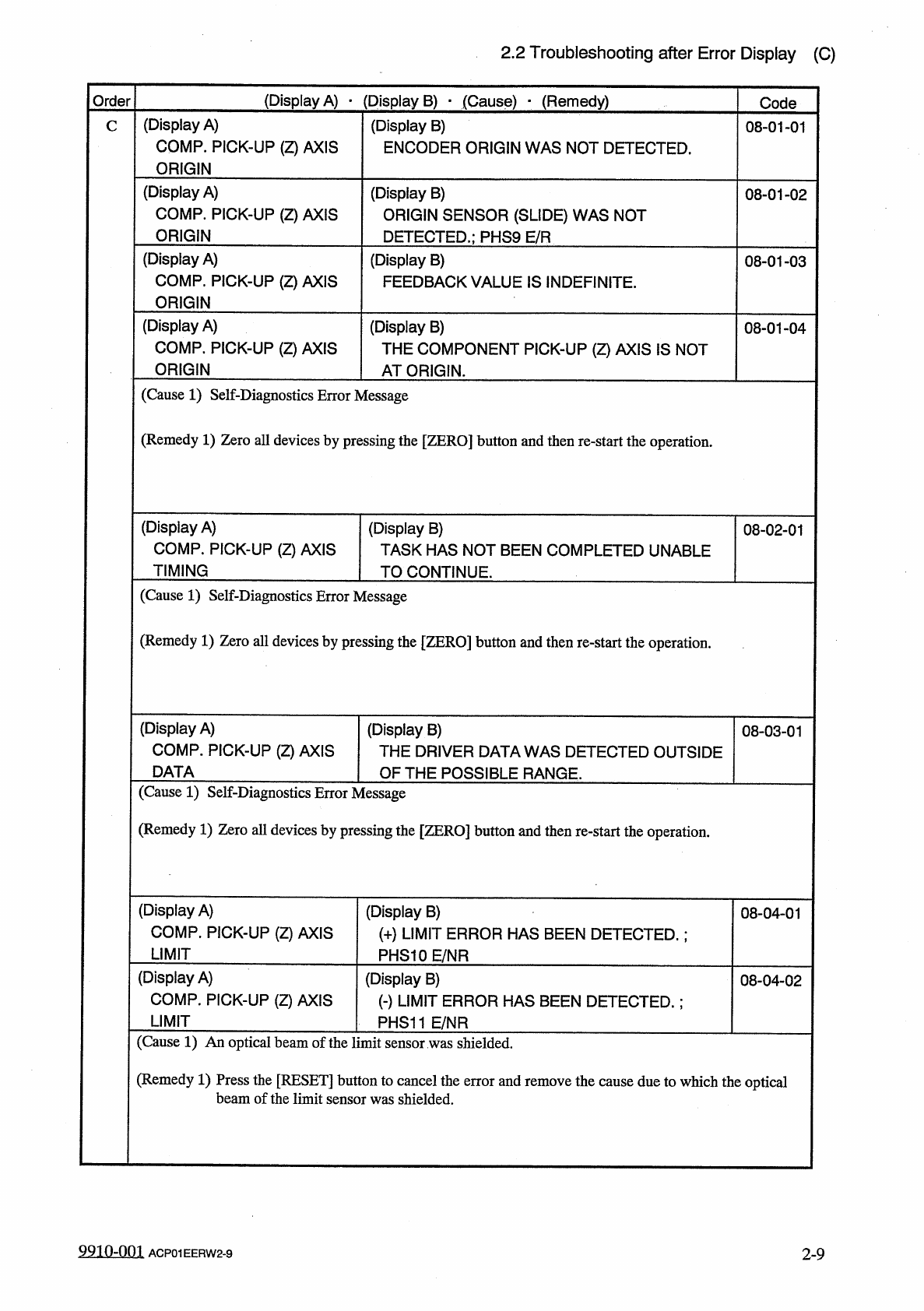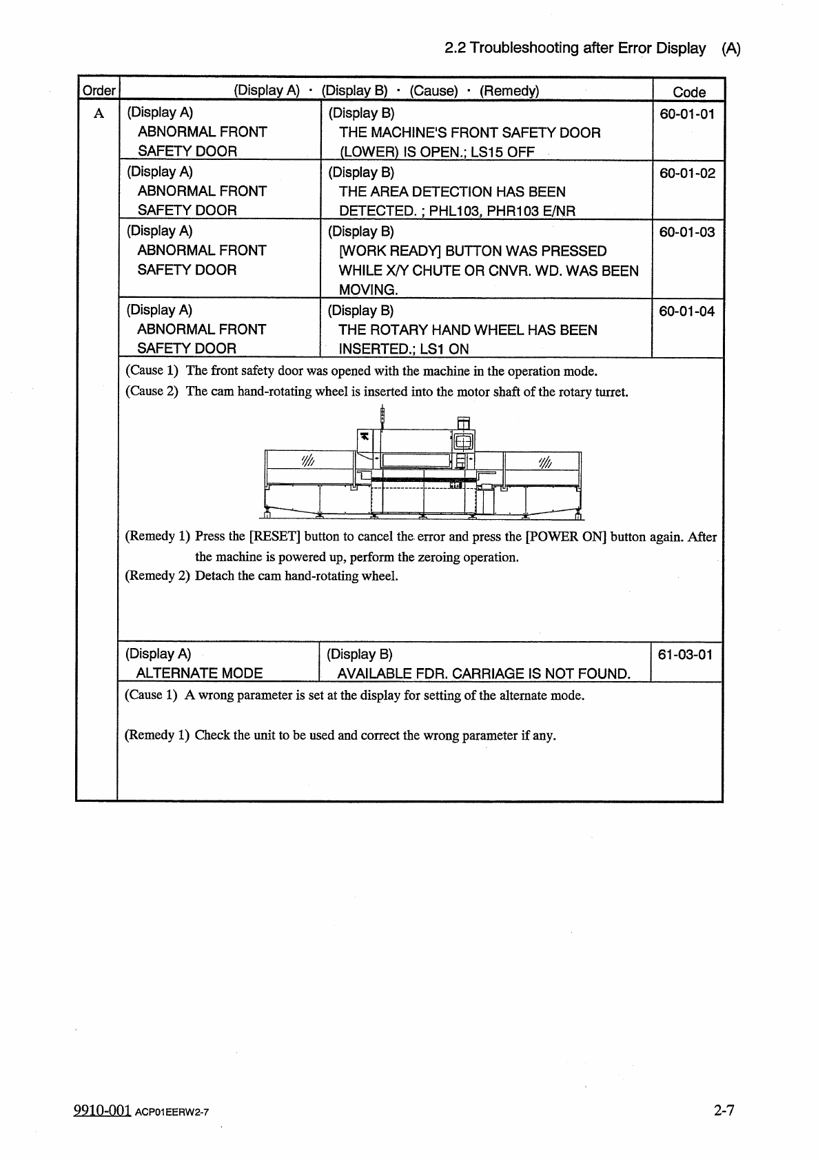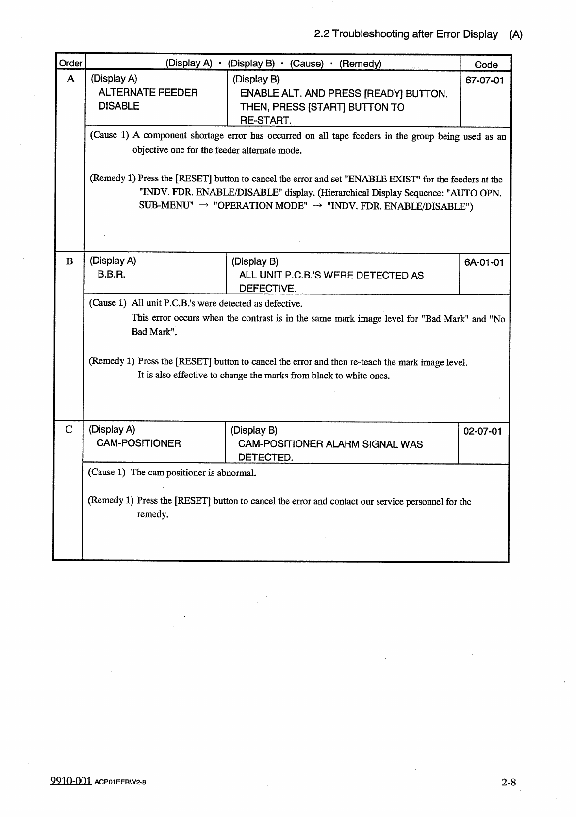 2.2 Troubleshooting after Error Display ( A ) ( Display A ) • ( Display B ) • ( Cause ) - ( Remedy ) Order Code ( Display A ) ALTERNATE FEEDER DISABLE ( Display B ) ENABLE ALT . AND PRESS [ READY ] BUTTON . THEN , PRESS …