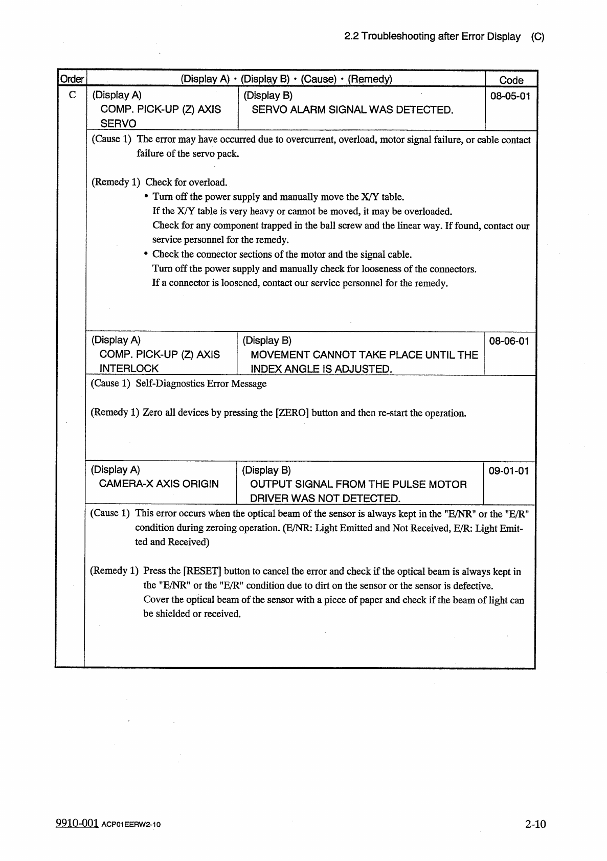 2.2 Troubleshooting after Error Display ( C ) Order ( Display A ) • ( Display B ) • ( Cause ) * ( Remedy ) Code ( Display A ) COMP . PICK - UP ( Z ) AXIS SERVO ( Display B ) SERVO ALARM SIGNAL WAS DETECTED . C 08 - 05 - …