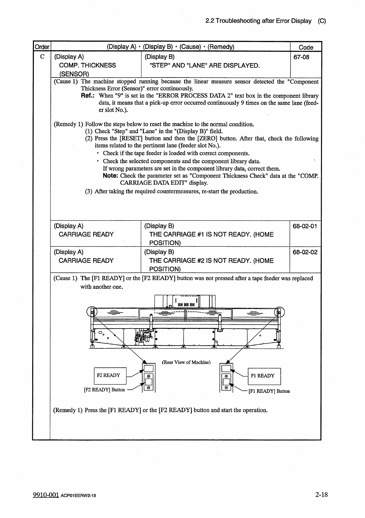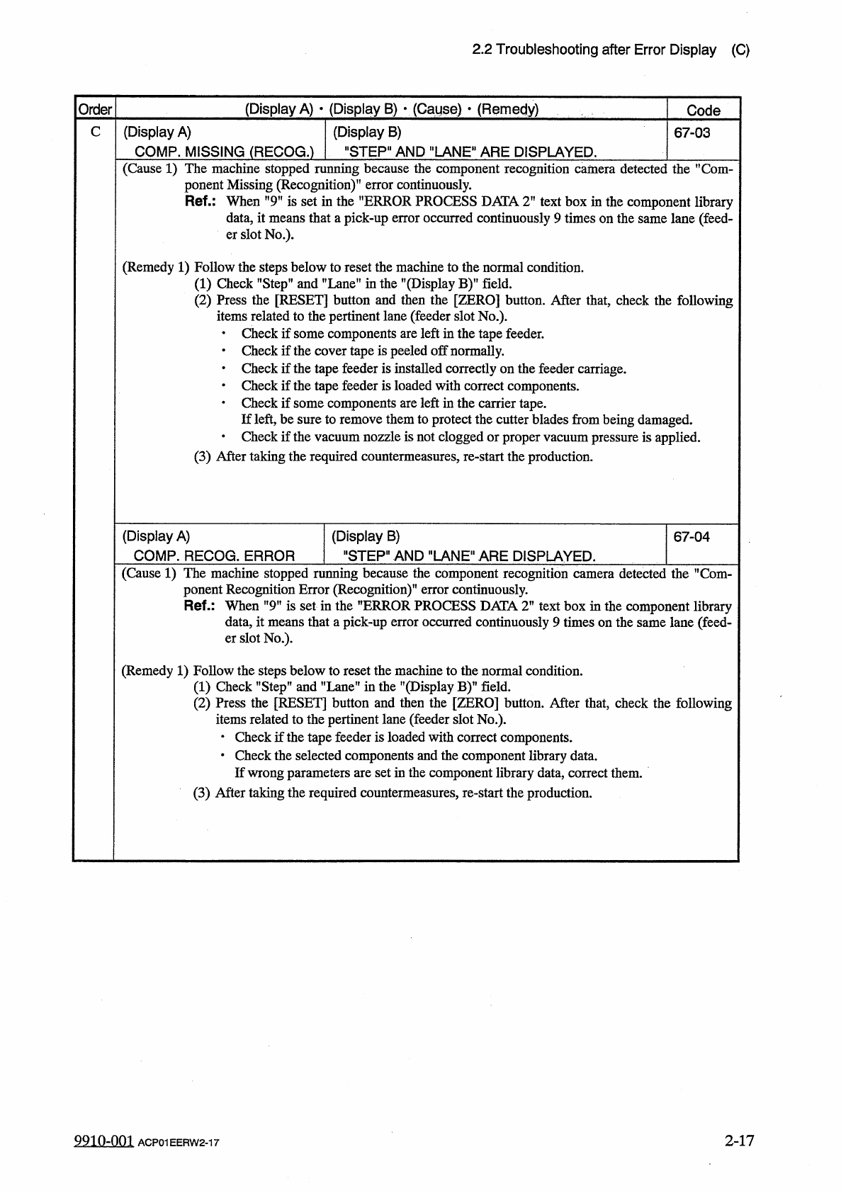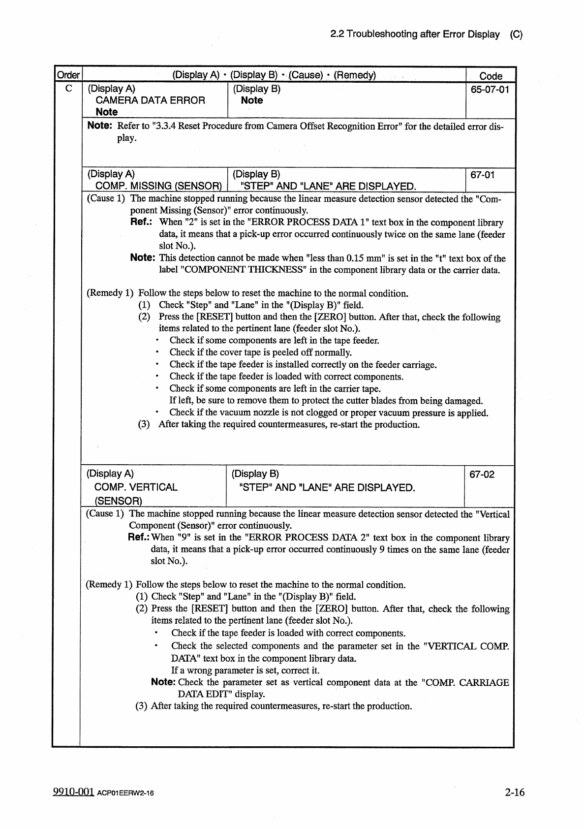 2.2 Troubleshooting after Error Display ( C ) Order ( Display A ) • ( Display B ) y ( Cause ) > ( Remedy ) Code C ( Display A ) COMP . MISSING ( RECOG . ) ( Display B ) " STEP " AND " LANE " ARE DI…