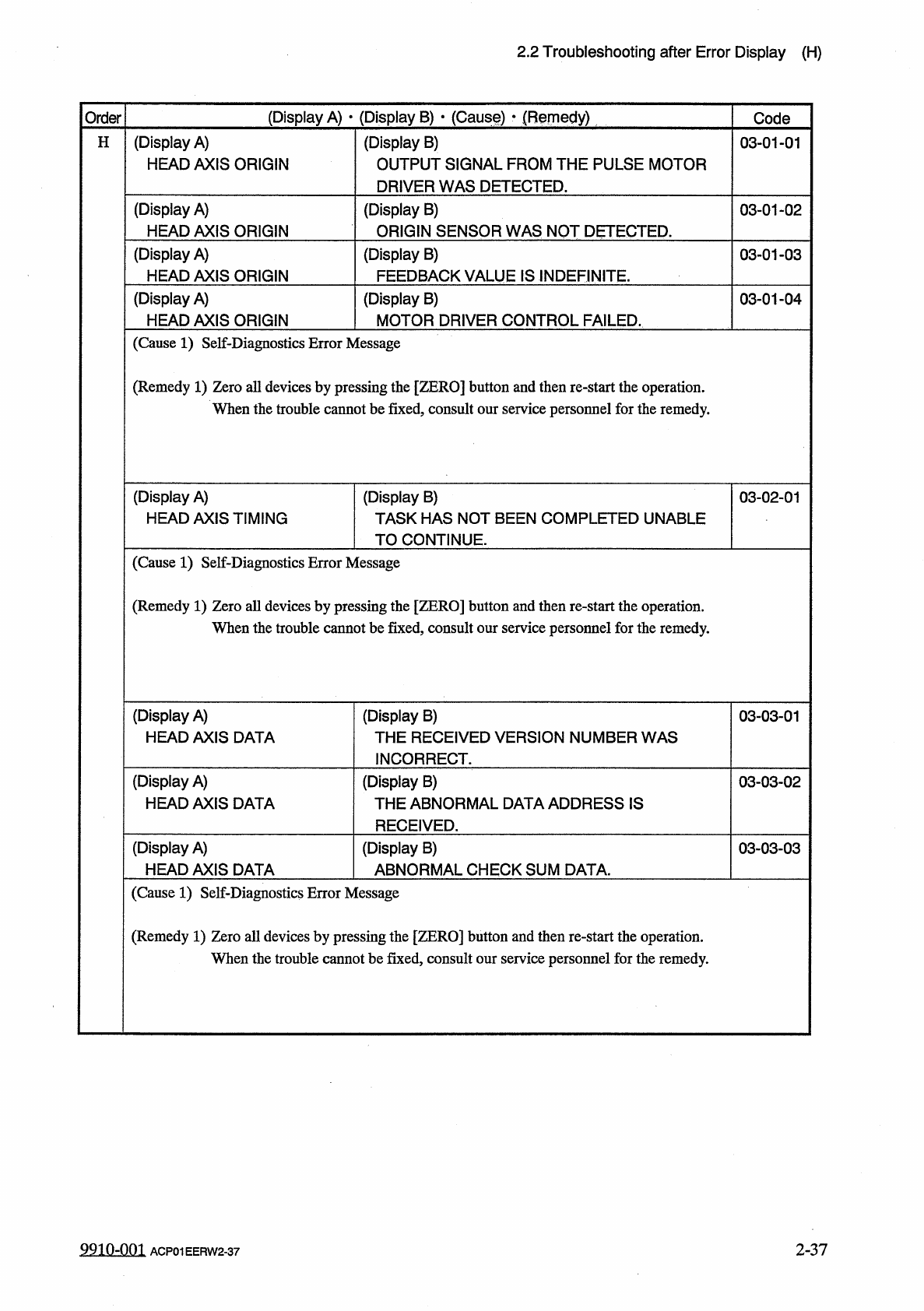 2.2 Troubleshooting after Error Display ( F ) ( Display A ) • ( Display B ) • ( Cause ) ■ ( Remedy ) Order Code ( Display A ) THE FEEDER INDEX LEVER # 1 F ( Display B ) THE FEEDER INDEX LEVER # 1 MOVES 64 - 06 - 02 DESPI…