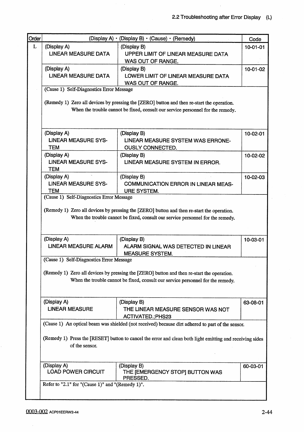 2.2 Troubleshooting after Error Display ( I ) Order ( Display A ) • ( Display B ) • ( CausQ ) • ( Remedy ) Code ( Display A ) ILLEGAL OPERATION I ( Display B ) THE OPERATION / SETUP SW HAS BEEN EN - ABLED WHILE THE BACKP…