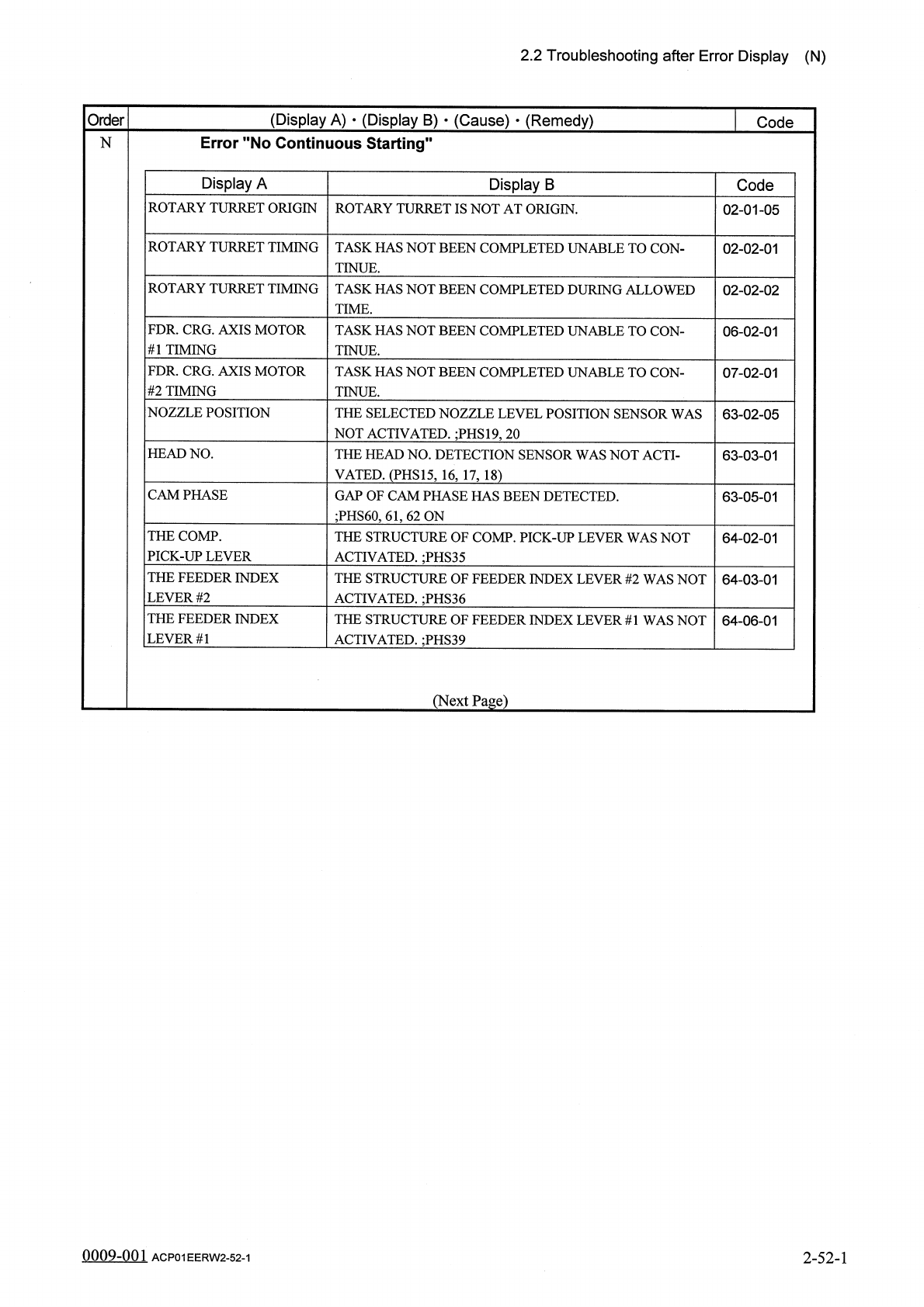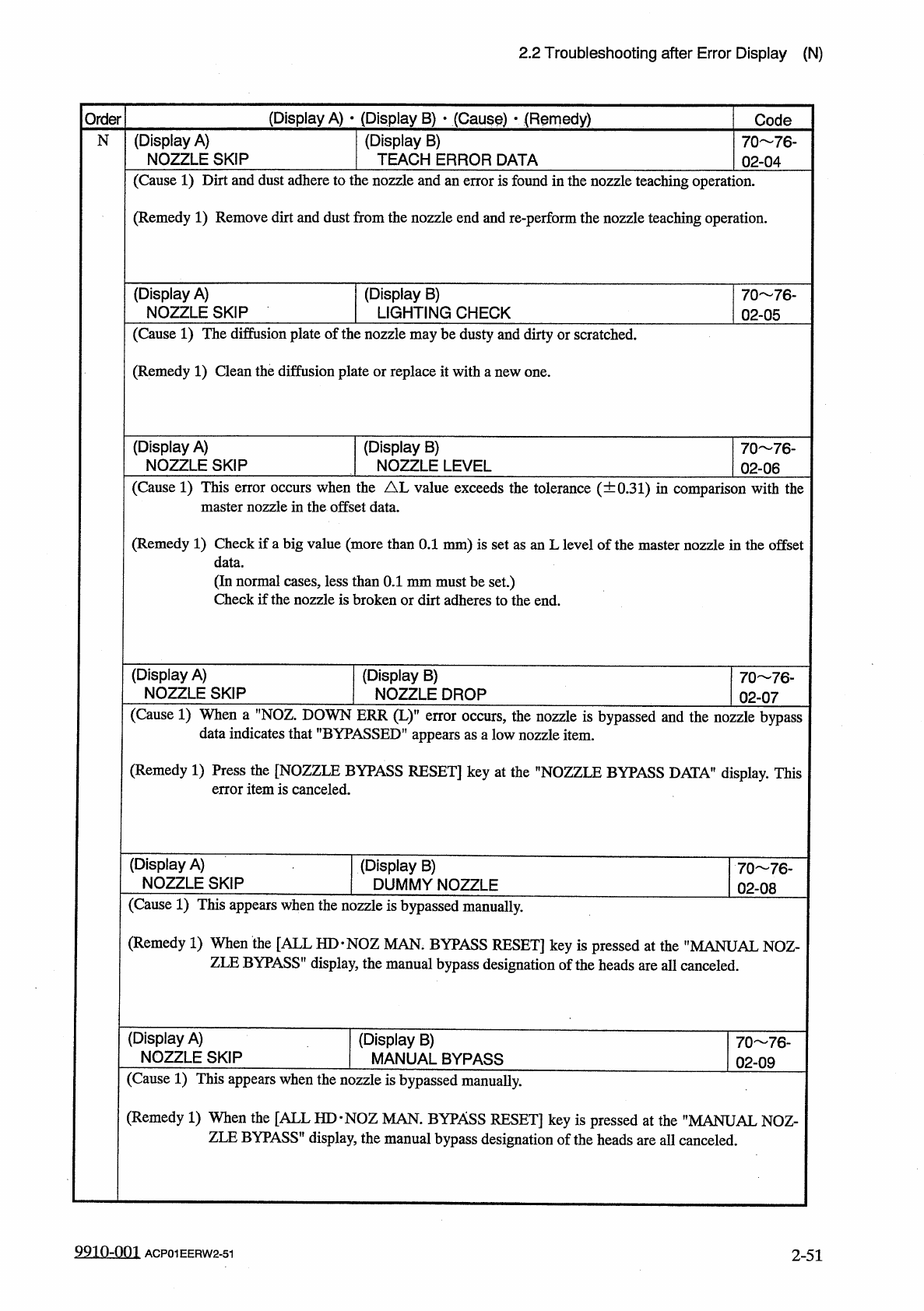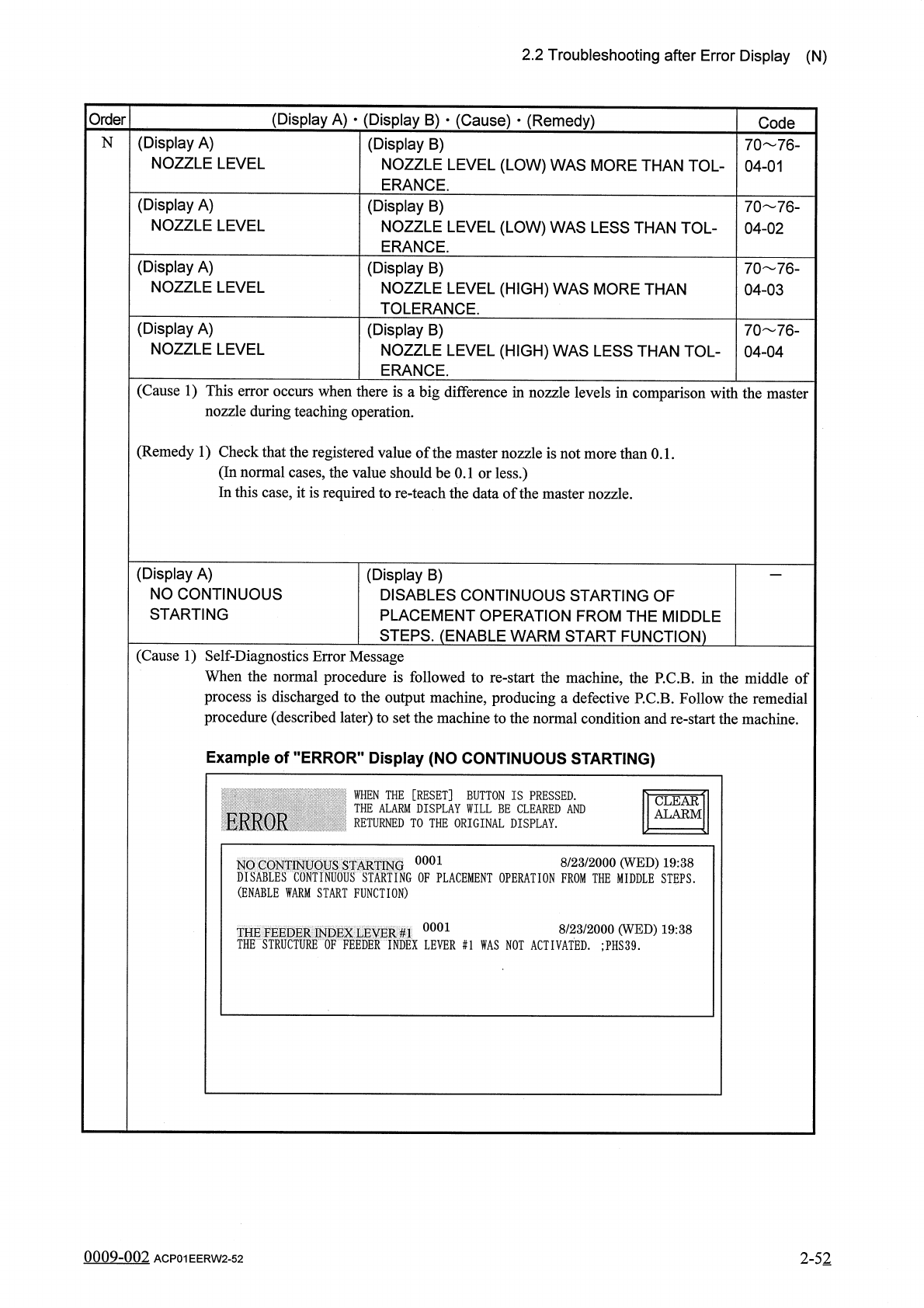 2.2 Troubleshooting after Error Display ( N ) ( Display A ) • ( Display B ) • ( Cause ) • ( Remedy ) Order Code ( Display A ) NOZZLE LEVEL N 70 76 - 04 - 01 ( Display B ) NOZZLE LEVEL ( LOW ) WAS MORE THAN TOL - ERANCE .…