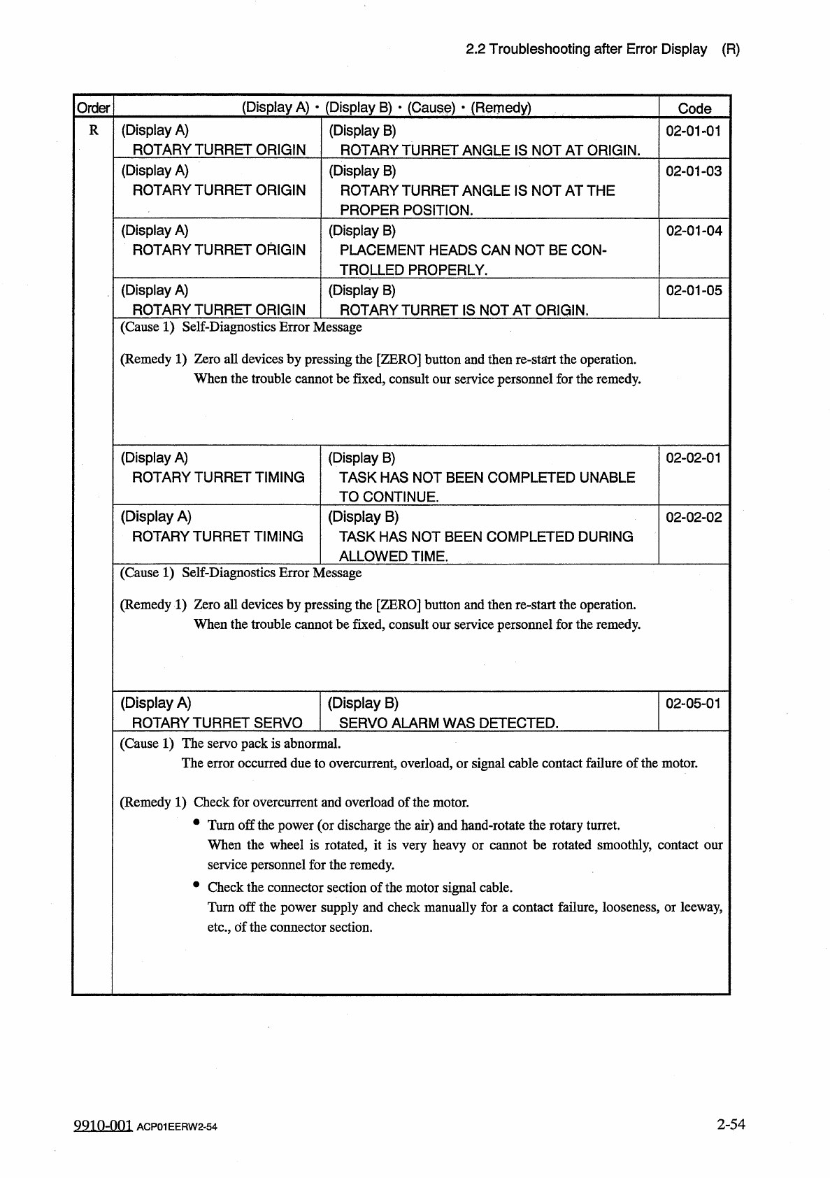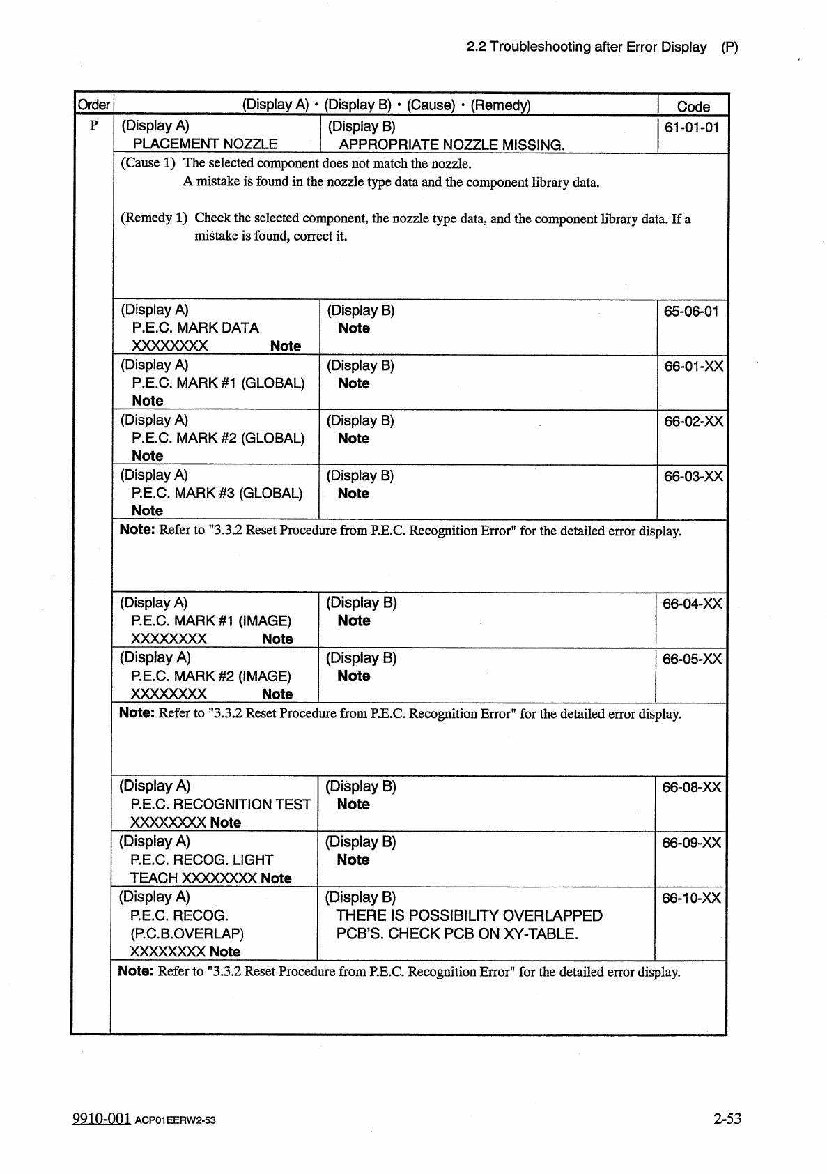 2.2 Troubleshooting after Error Display ( P ) ( Display A ) • ( Display B ) • ( Cause ) • ( Remedy ) Order Code ( Display A ) PLACEMENT NOZZLE P ( Display B ) APPROPRIATE NOZZLE MISSING . 61 - 01 - 01 ( Cause 1 ) The sel…