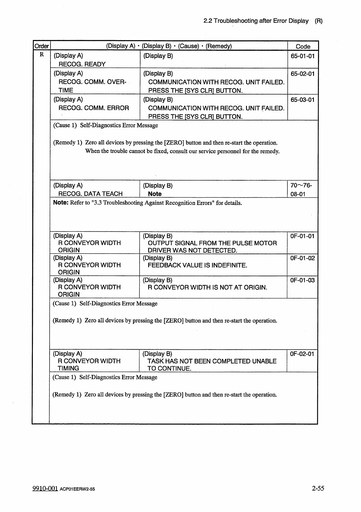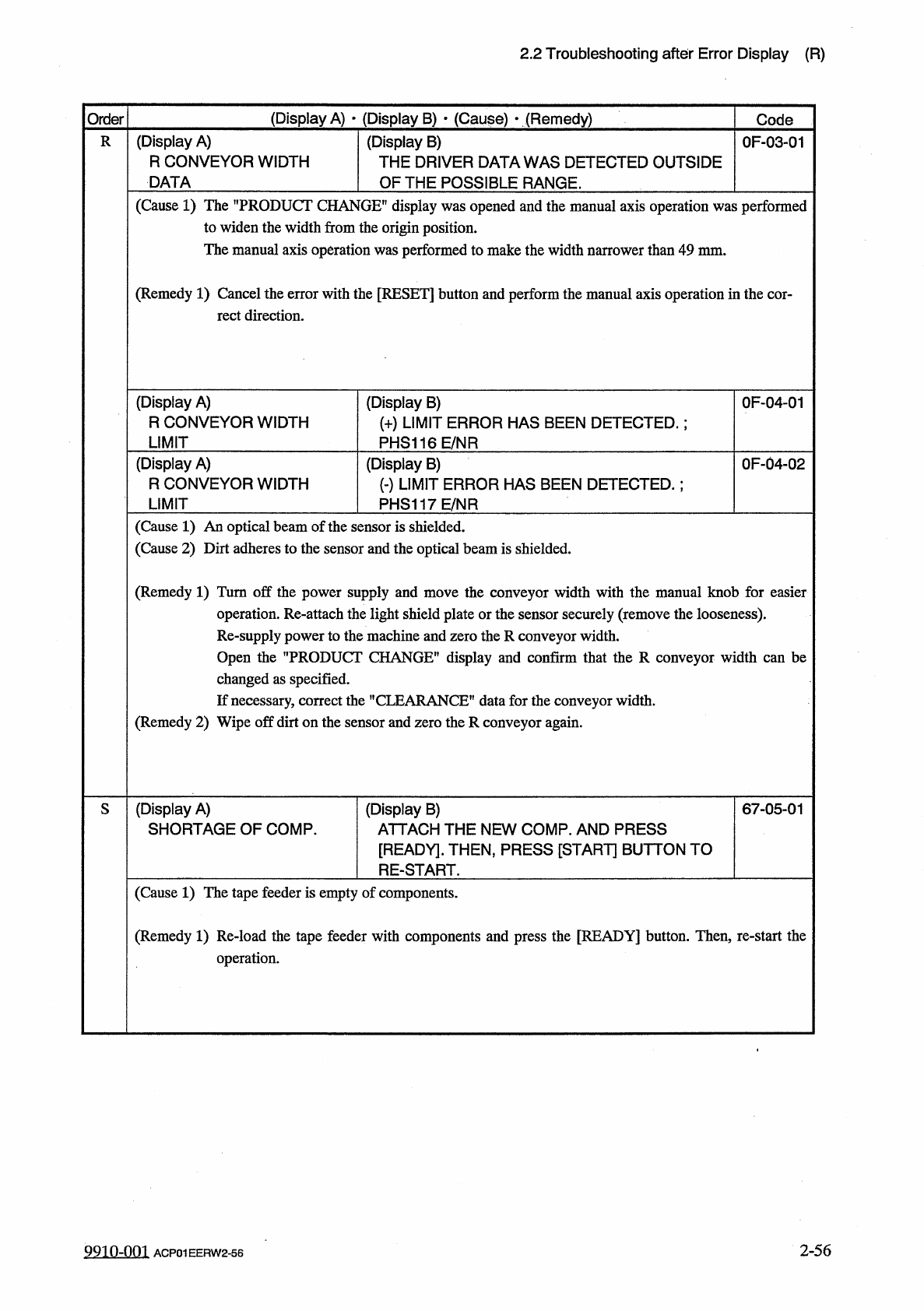 2.2 Troubleshooting after Error Display ( R ) ( Display A ) • ( Display B ) • ( Cause ) > ( Remedy ) Order Code ( Display A ) R CONVEYOR WIDTH DATA ( Display B ) THE DRIVER DATA WAS DETECTED OUTSIDE OF THE POSSIBLE RA…