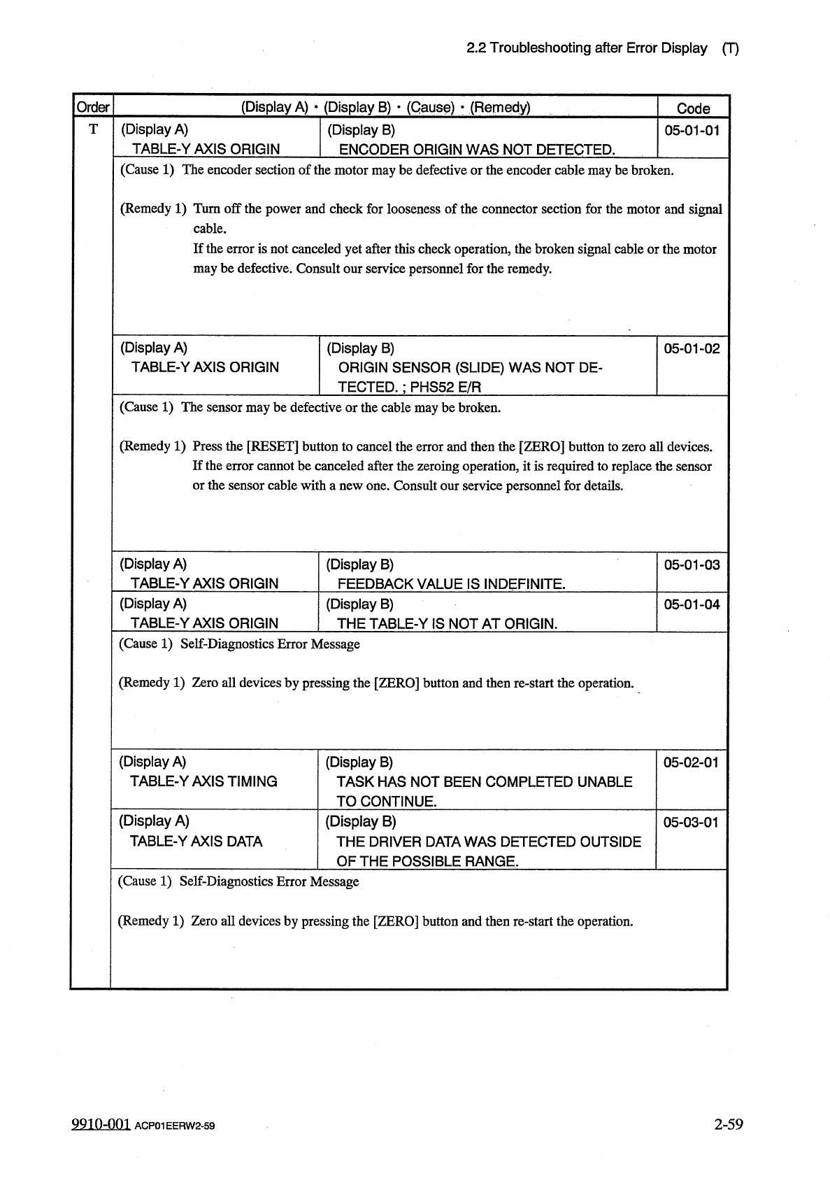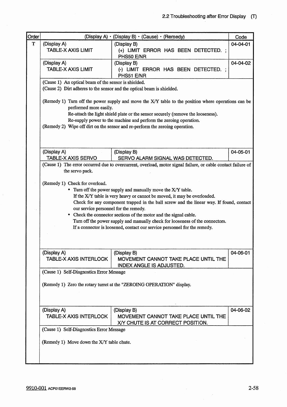 2.2 Troubleshooting after Error Display ( T ) ( Display A ) • ( Display B ) • ( Cause ) • ( Remedy ) Order Code ( Display A ) TABLE - XAXIS LIMIT T ( Display B ) ( + ) LIMIT ERROR HAS BEEN DETECTED . : PHS 50 E / NR 04 -…