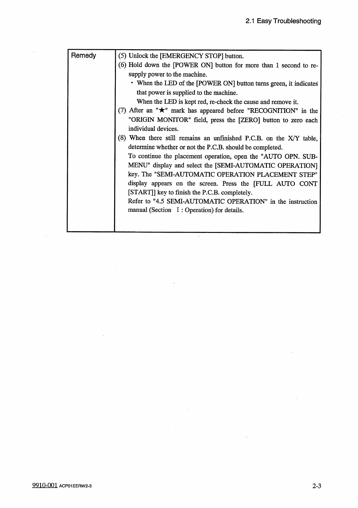 2.1 Easy Troubleshooting Remedy ( 5 ) Unlock the [ EMERGENCY STOP ] button . ( 6 ) Hold down the [ POWER ON ] button for more than 1 second to re - supply power to the machine . • When the LED of the [ POWER ON ] button …