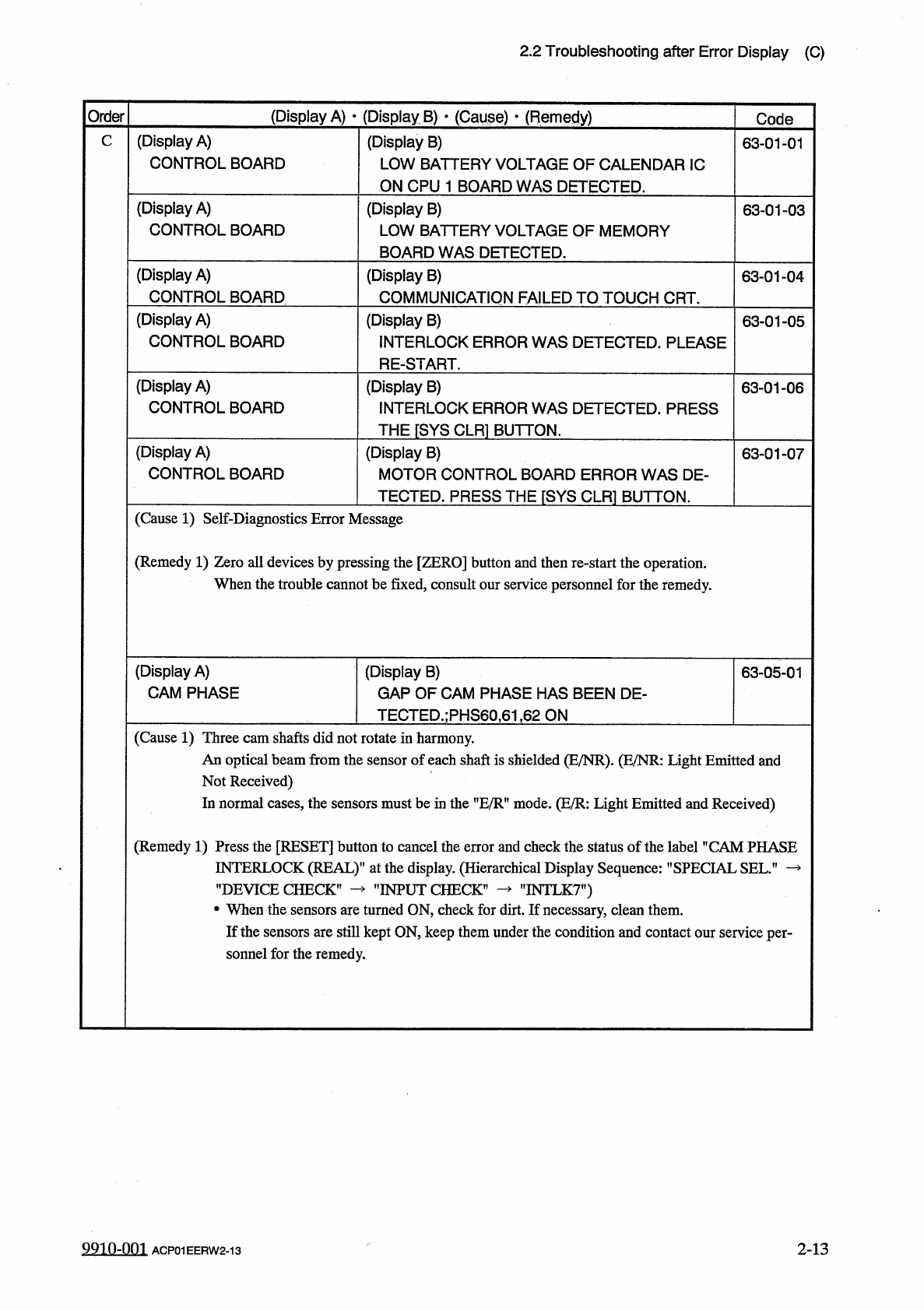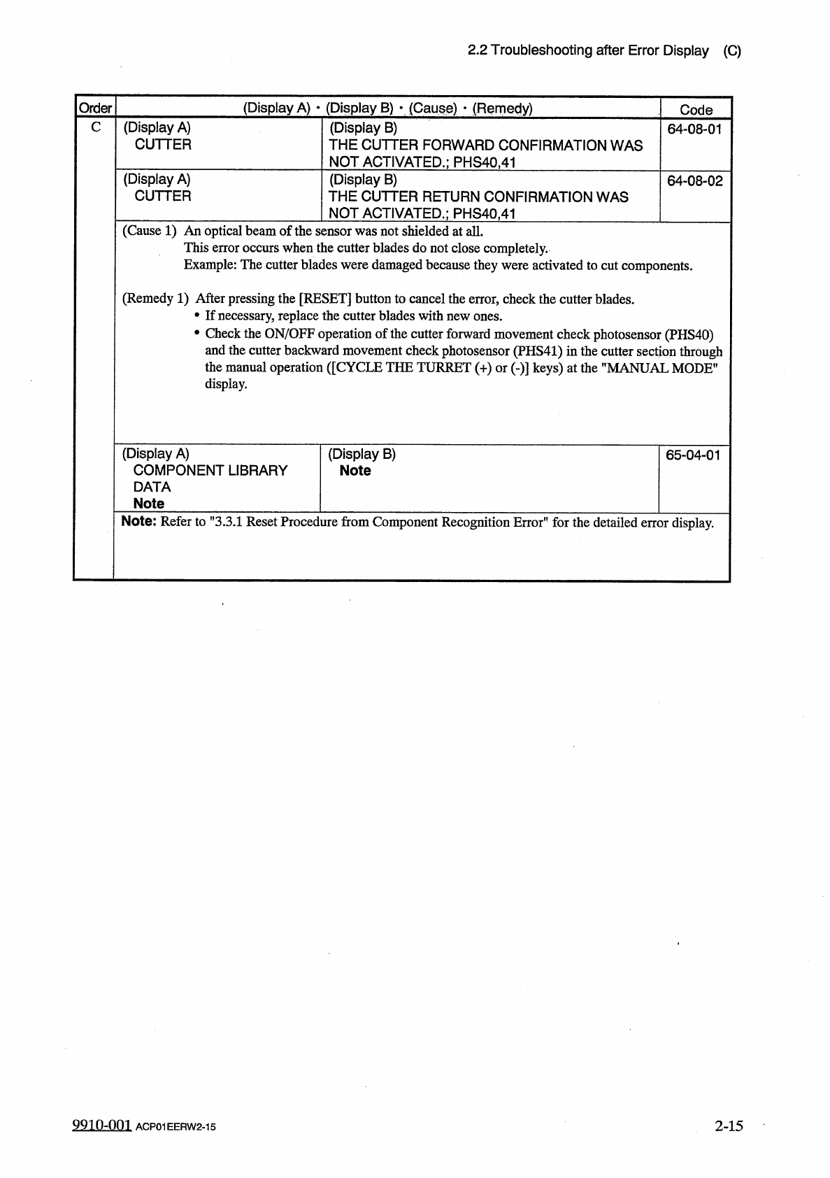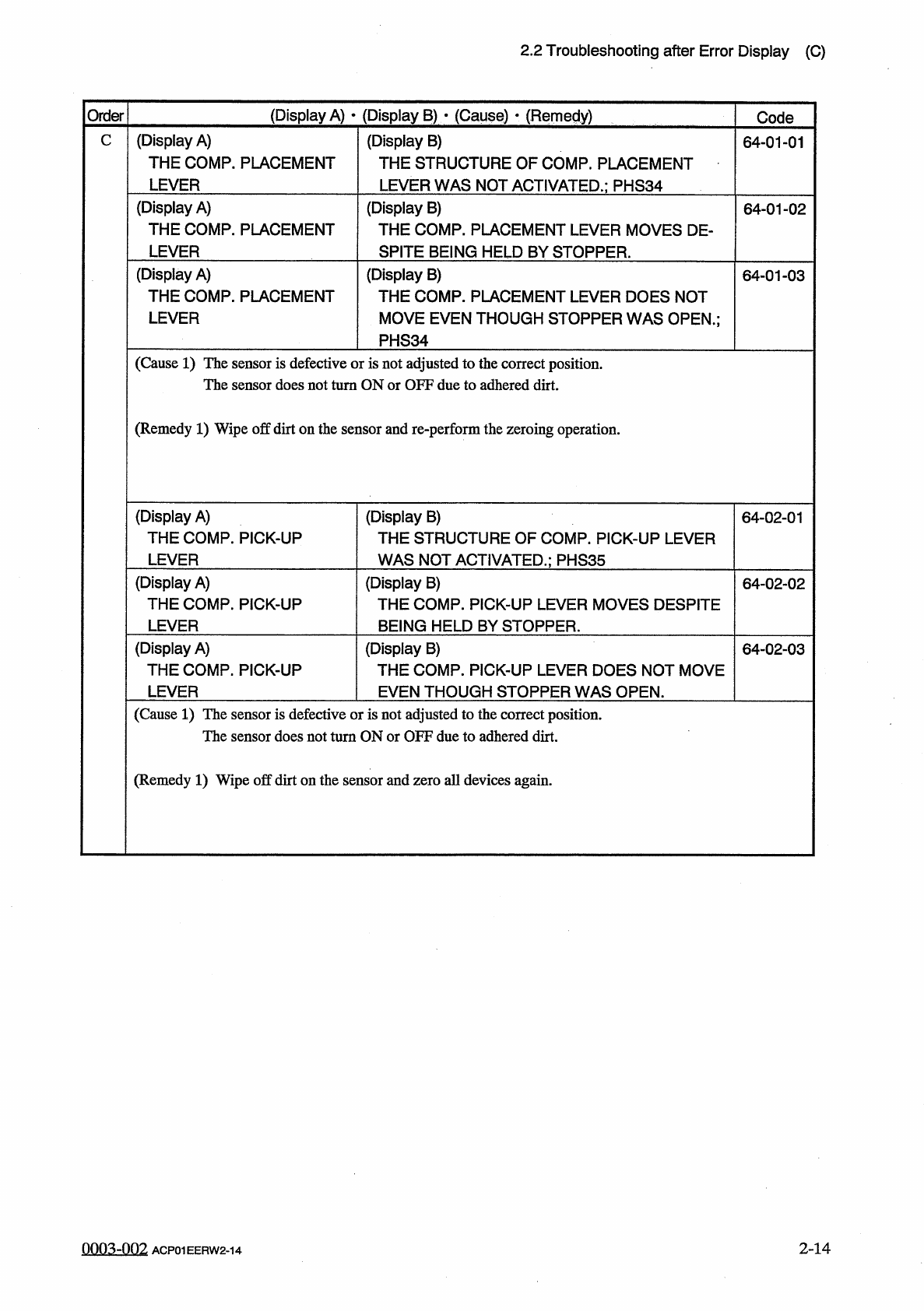 2.2 Troubleshooting after Error Display ( C ) ( Display A ) • ( Display B ) • ( Cause ) • ( Remedy ) Order Code ( Display A ) THE COMP . PLACEMENT LEVER C ( Display B ) THE STRUCTURE OF COMP . PLACEMENT LEVER WAS NOT ACT…