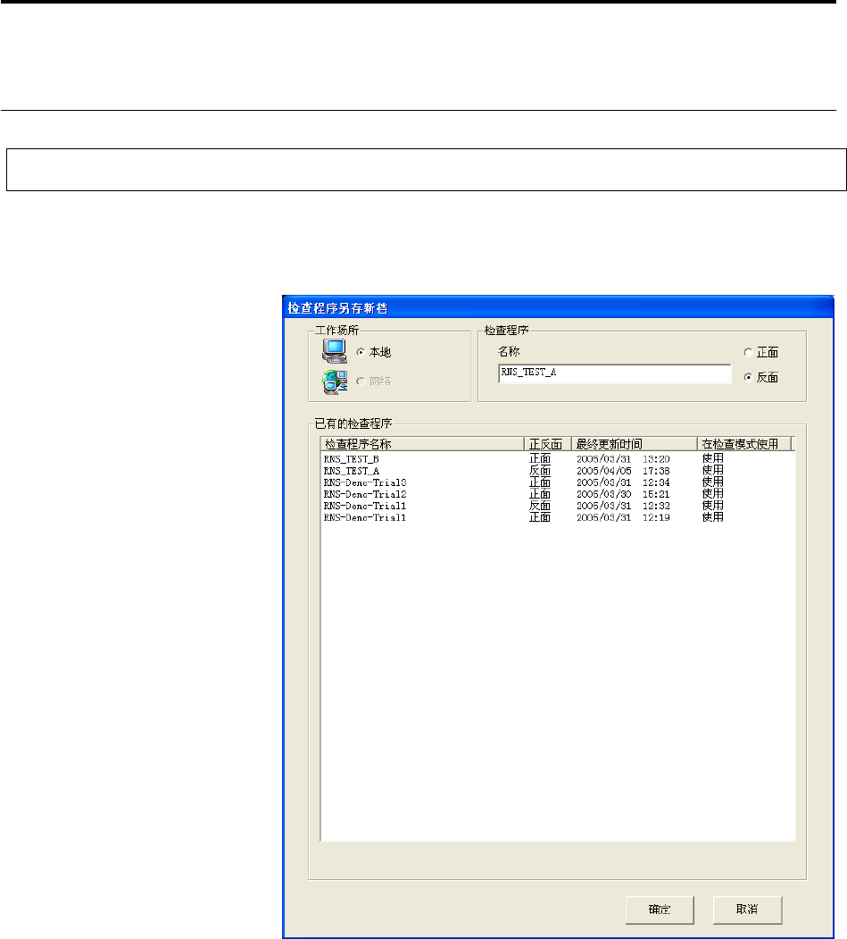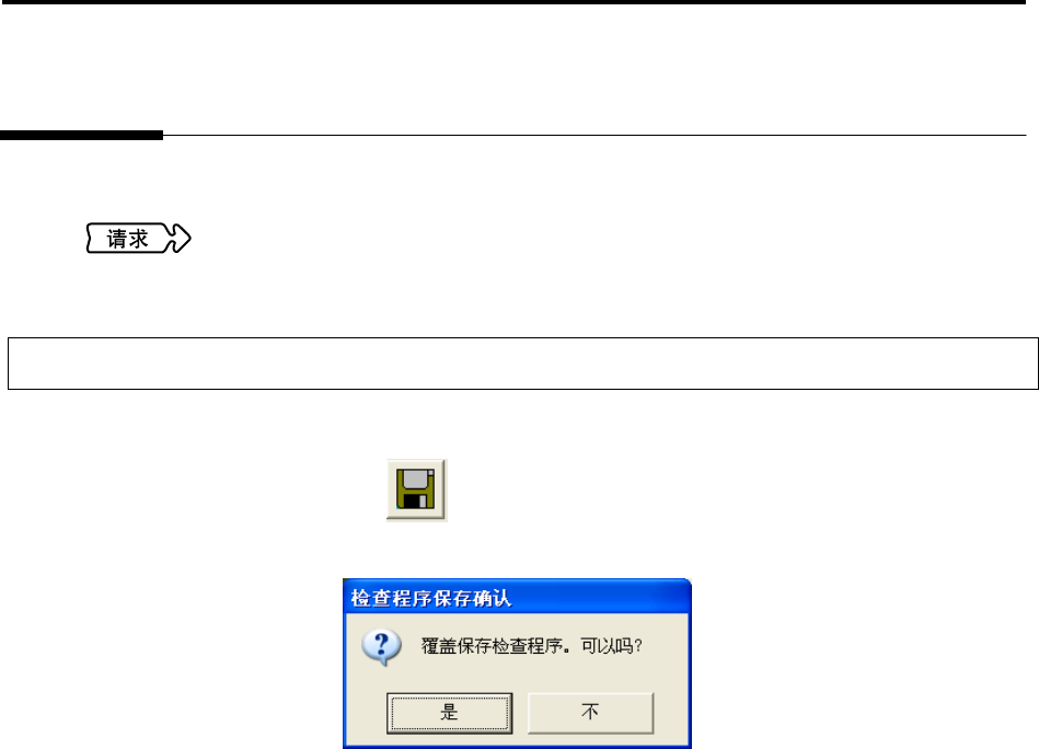 2.7 保存检查程序 2-85 2.7 保存检查程序 保存制作的检查程序的内容。 编程结束时虽可以集中保存, 但在出现操作失误或硬盘障害等不能预 计的事态时, 为了 最小限度避免数据的丢失,建议您恰 当地保存。 2.7.1 覆盖保存 覆盖保存制作的程序。 1. 单击 (覆盖保存) 。 或从菜单栏选择 [文件] ― [检查程序保存] ― [保存]。 显示「检查程序保存确认」对话窗。 2. 单击[是]。 覆盖保存程序。 操作顺序