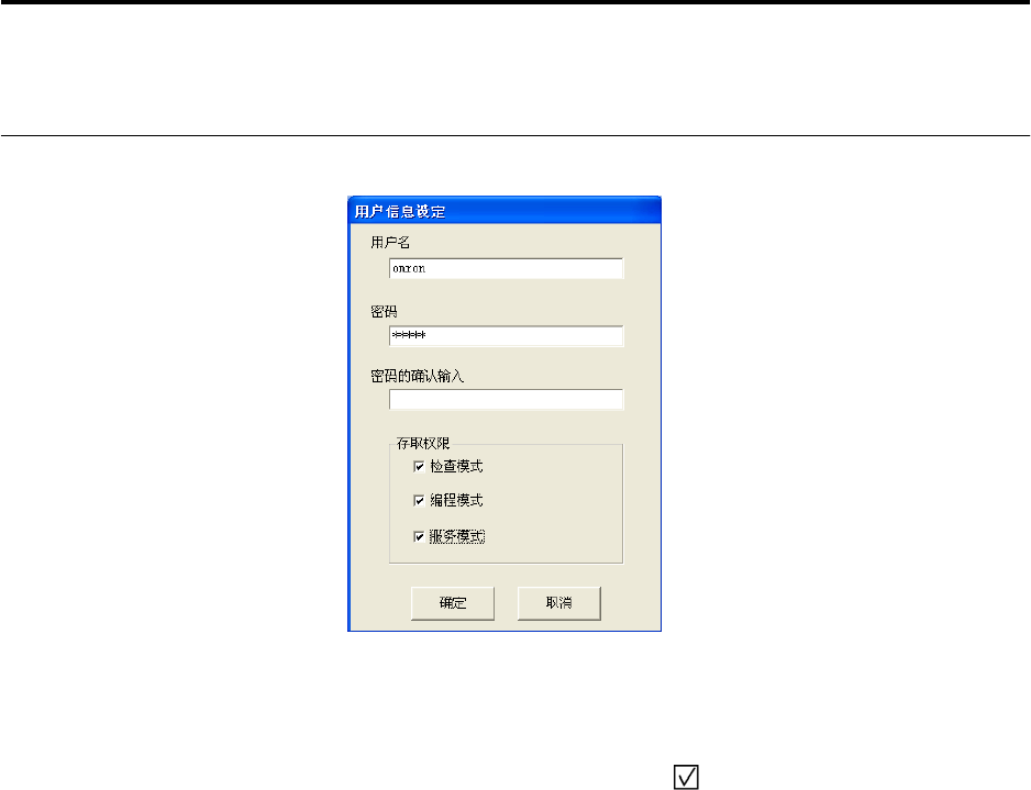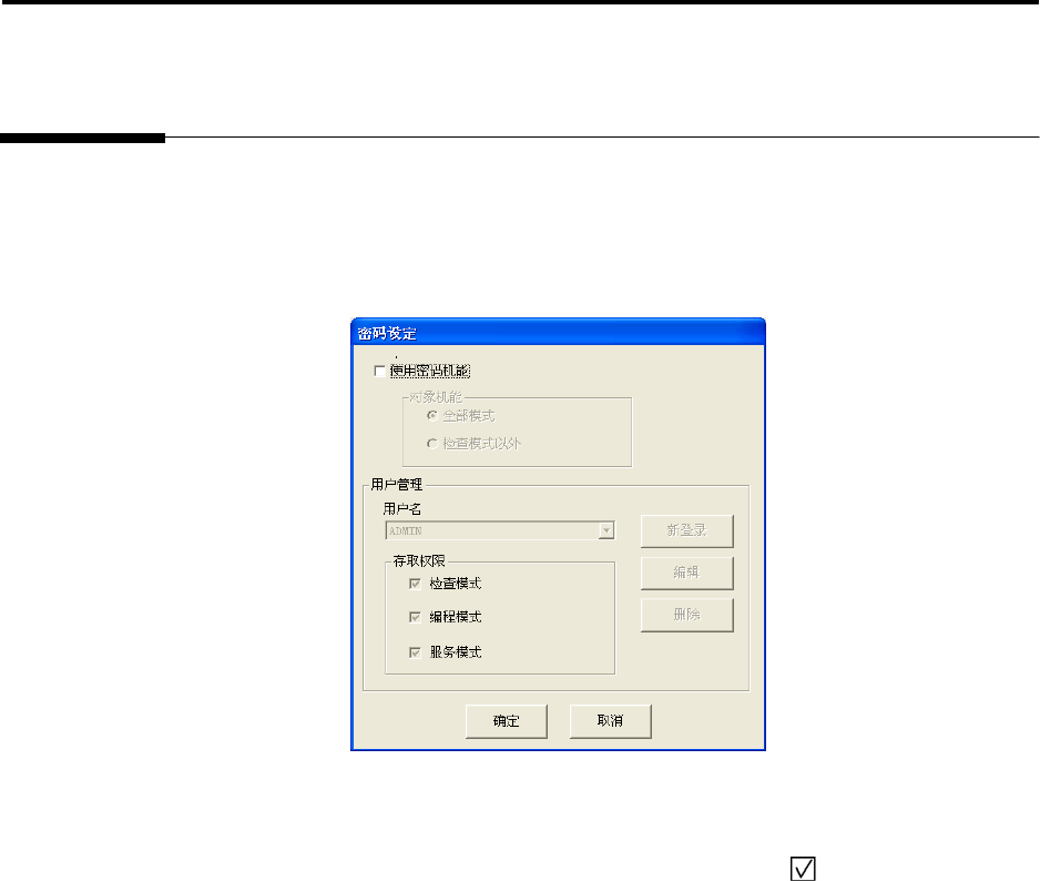 3.2 设 定密码 3-3 3.2 设定密码 设定密码机能的使用/未使用。此外 ,设定用户名和密码。 在此对使用密码机能设定新用户的顺 序进行说明。 1. 从服务模式的初始菜单选择[密码设 定]。 显示 「 密码设定」对话窗。 ・ 在此单击[取消],则对变 更的内容不作保存,关闭 「 密码设定 」对 话窗。 2. 使用密码时,单击[使用密码机能] 使之显示 标记。 3. 选择密码的对象。 以检查 、 编程、维修的所有项目为对 象时,选择…